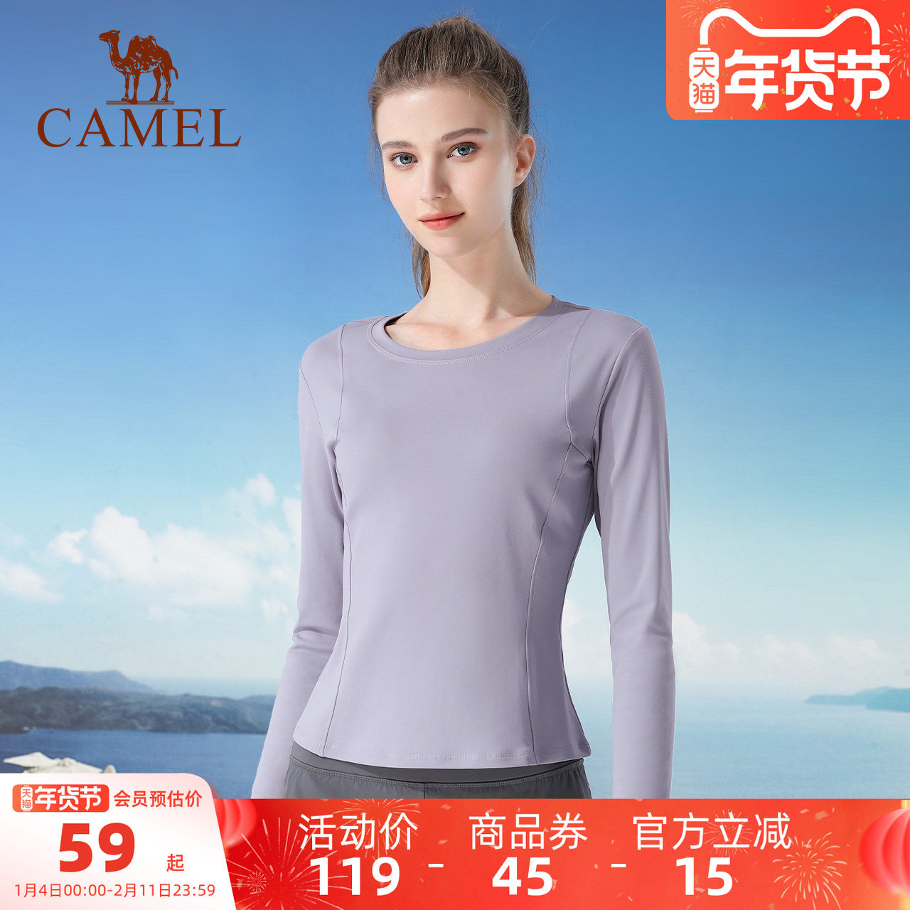 骆驼女装长袖T恤女春秋新款薄绒保暖运动圆领修身纯色上衣打底衫