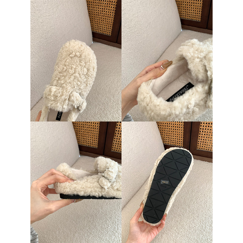 ~厚底羊羔毛女冬外穿保暖棉鞋加绒勃肯鞋一脚蹬豆豆鞋内增高白色