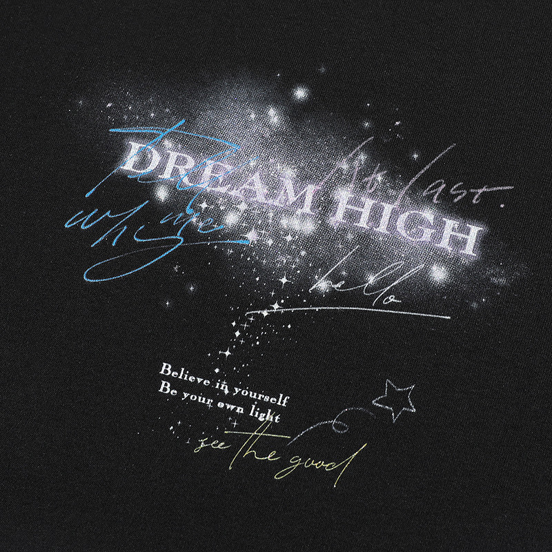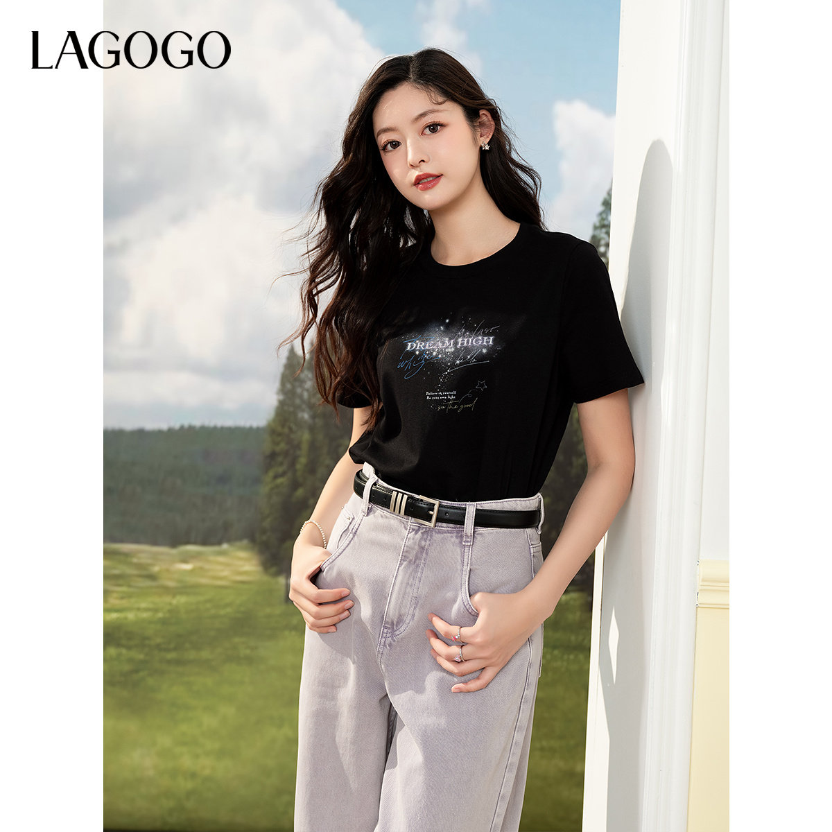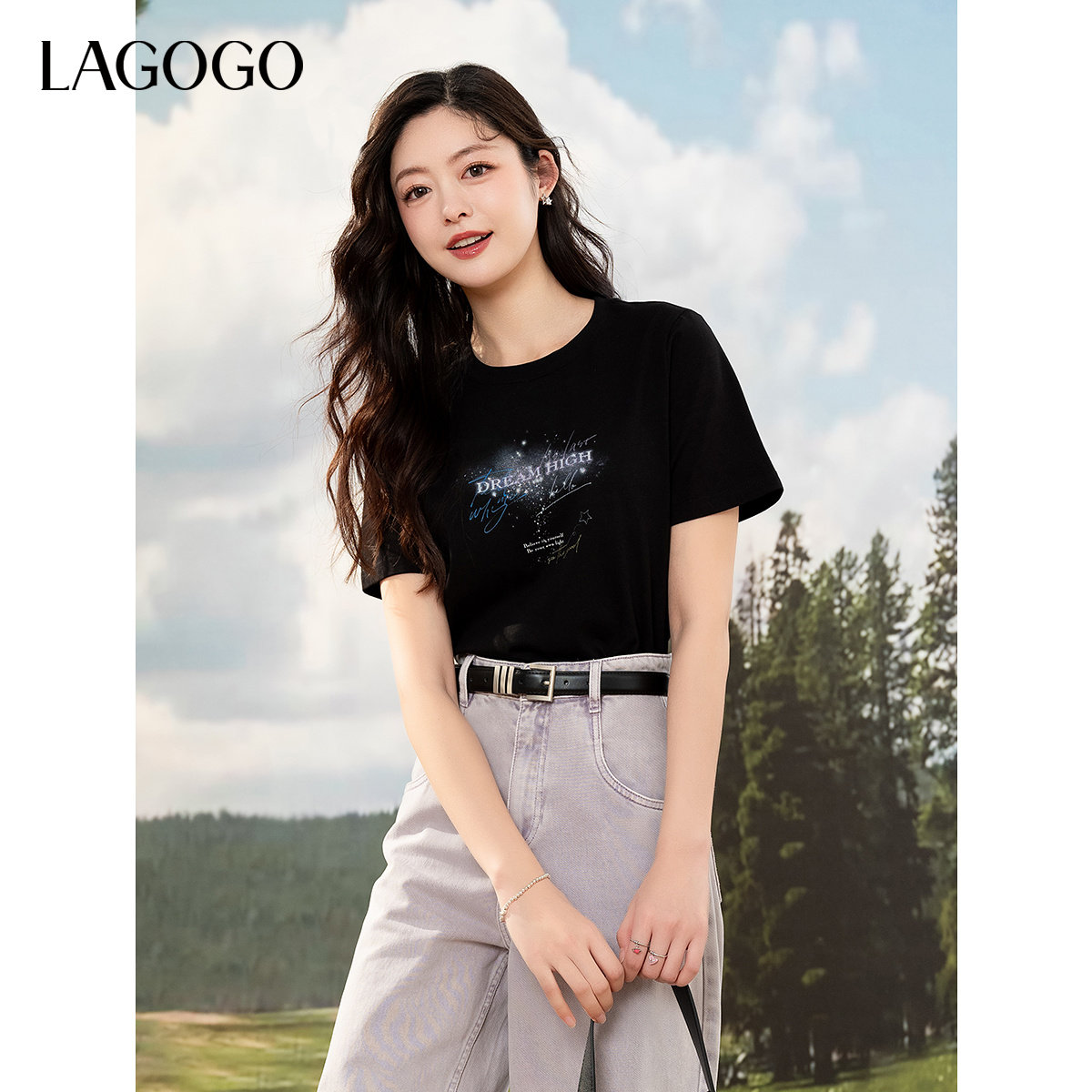 LAGOGO珠光质感星空印花T恤女拉谷谷2026年夏季新款独特纯棉黑色t