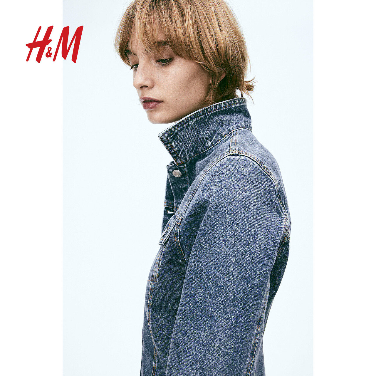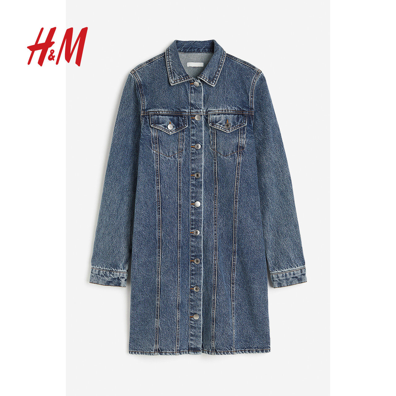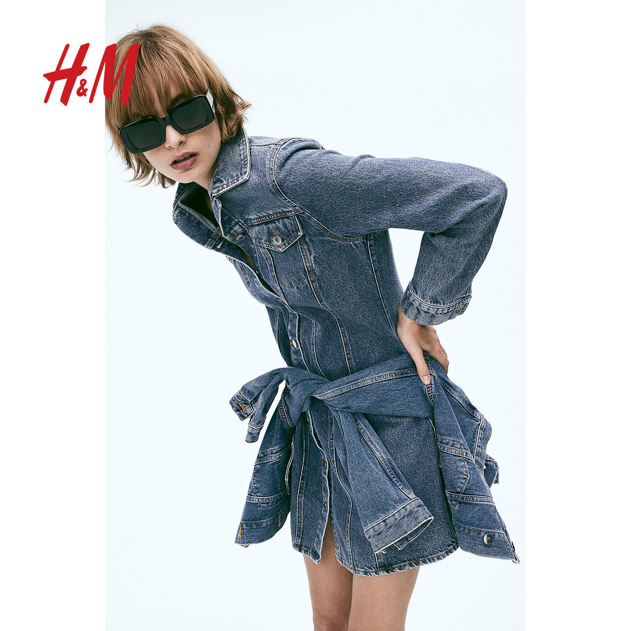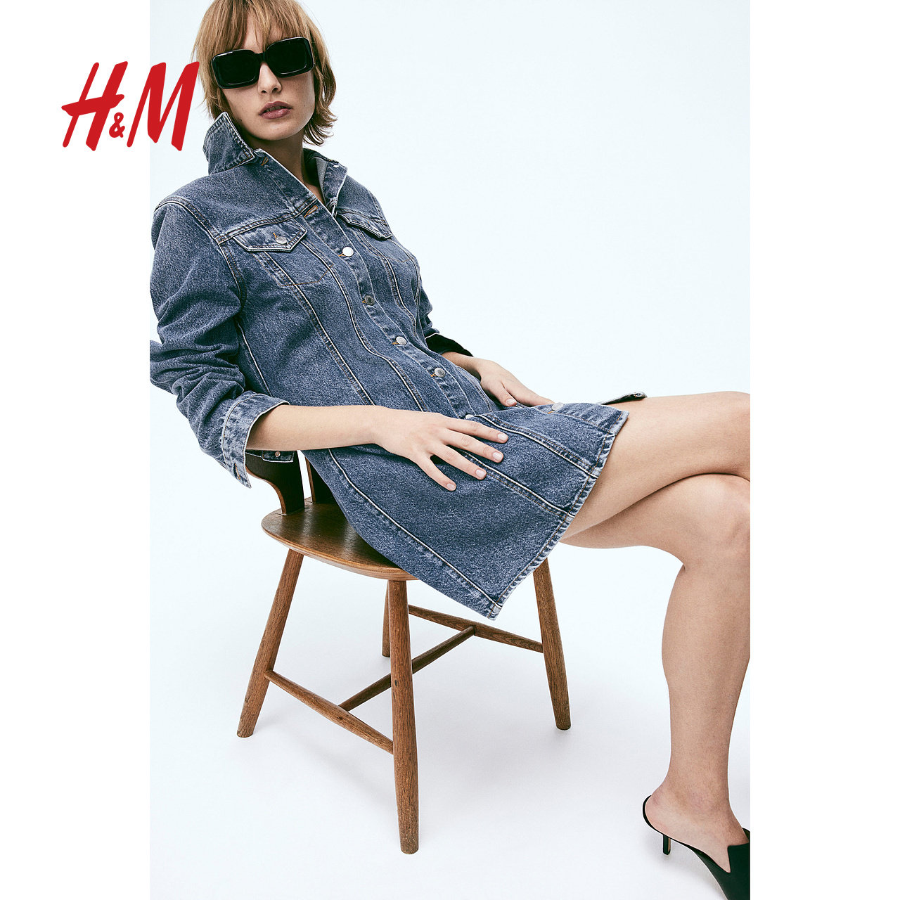 HM女装连衣裙秋季休闲风翻领牛仔A字修身长袖短裙1215380