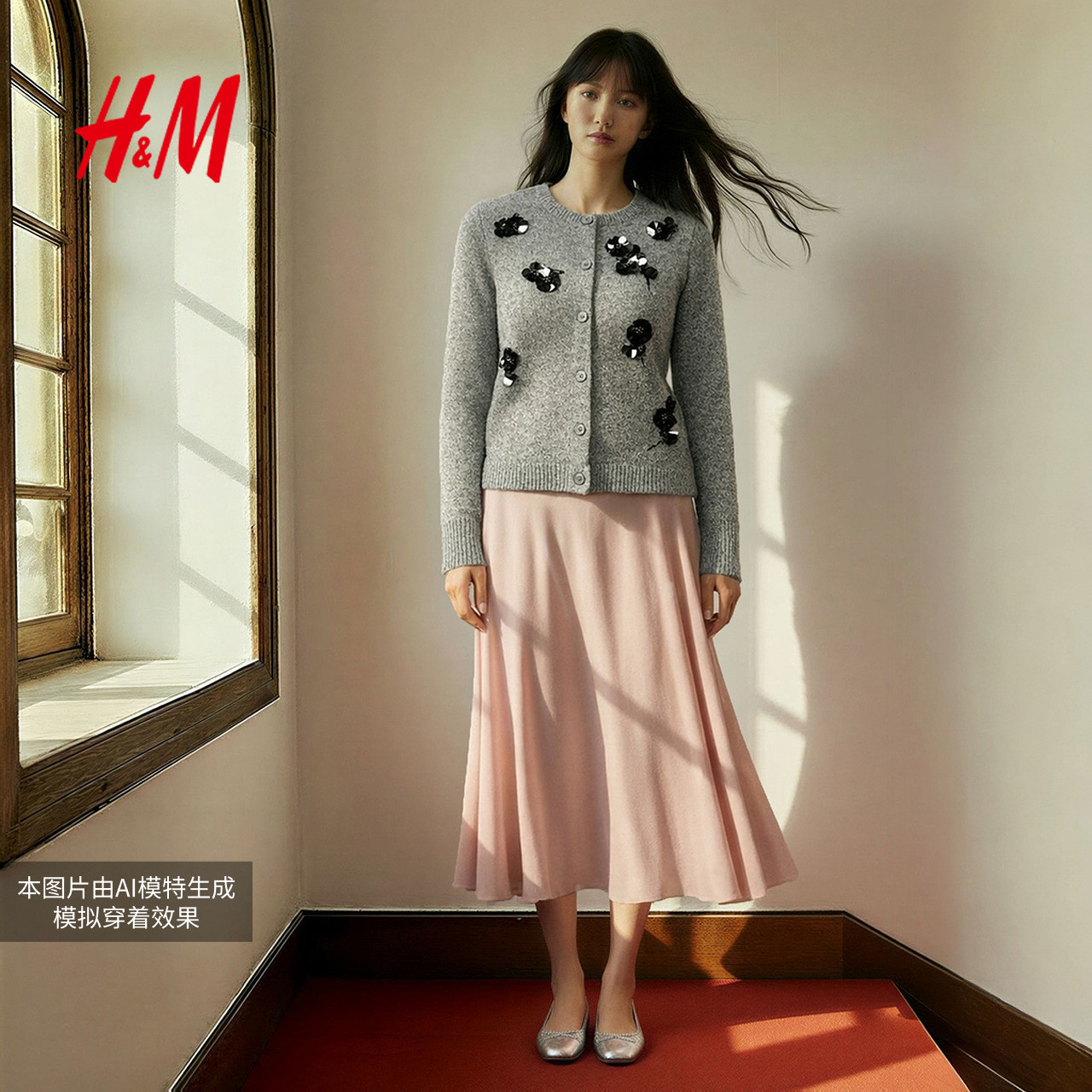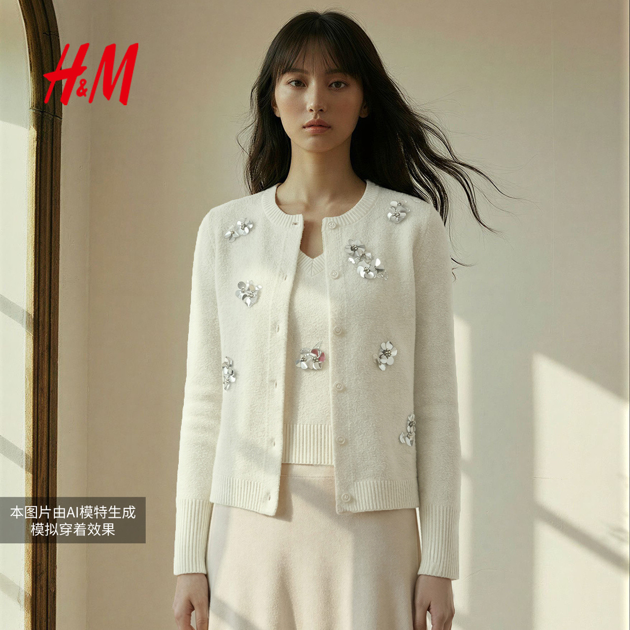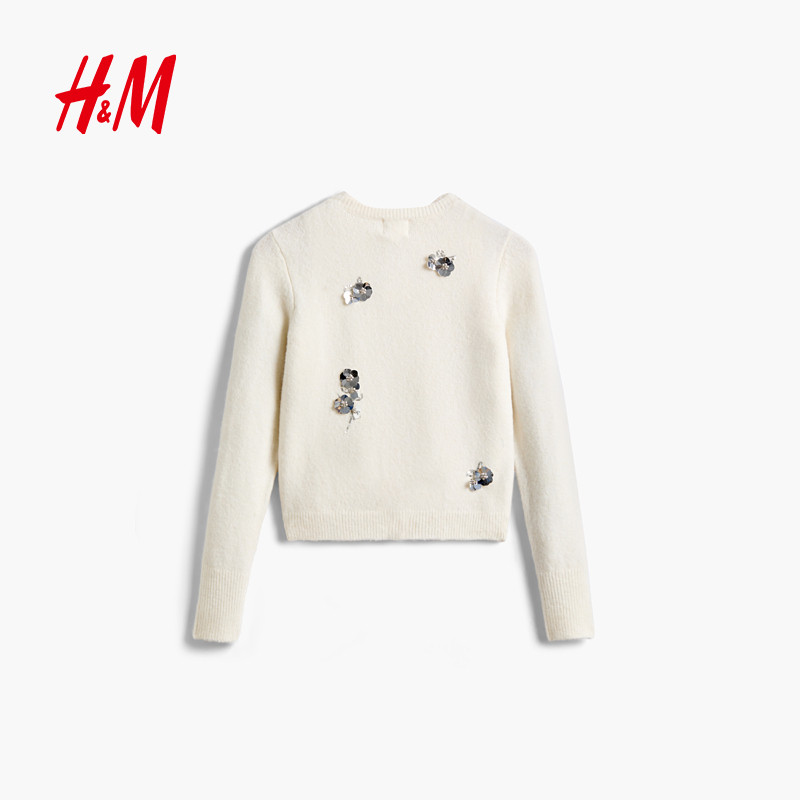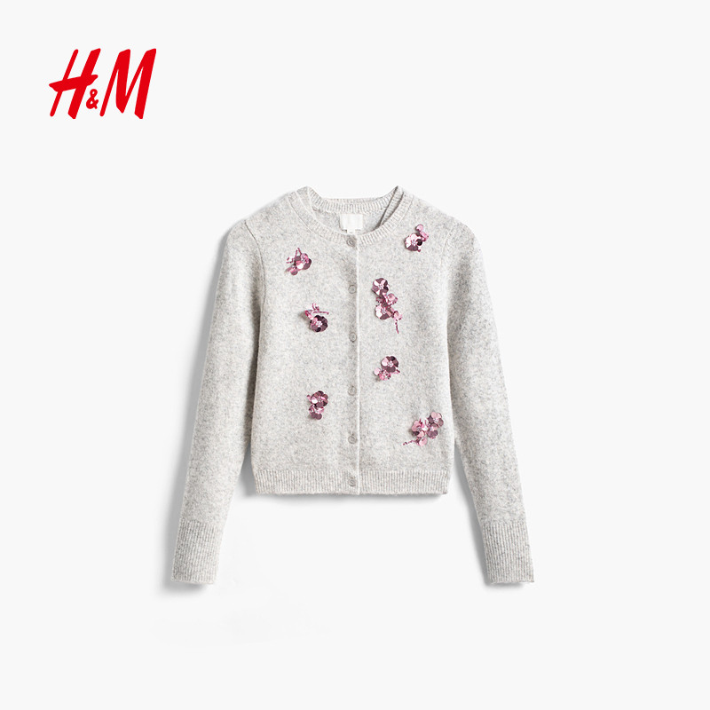 HM女装毛针织衫新年款手工钉珠刺绣舒芙蕾开衫背心两件套1000071