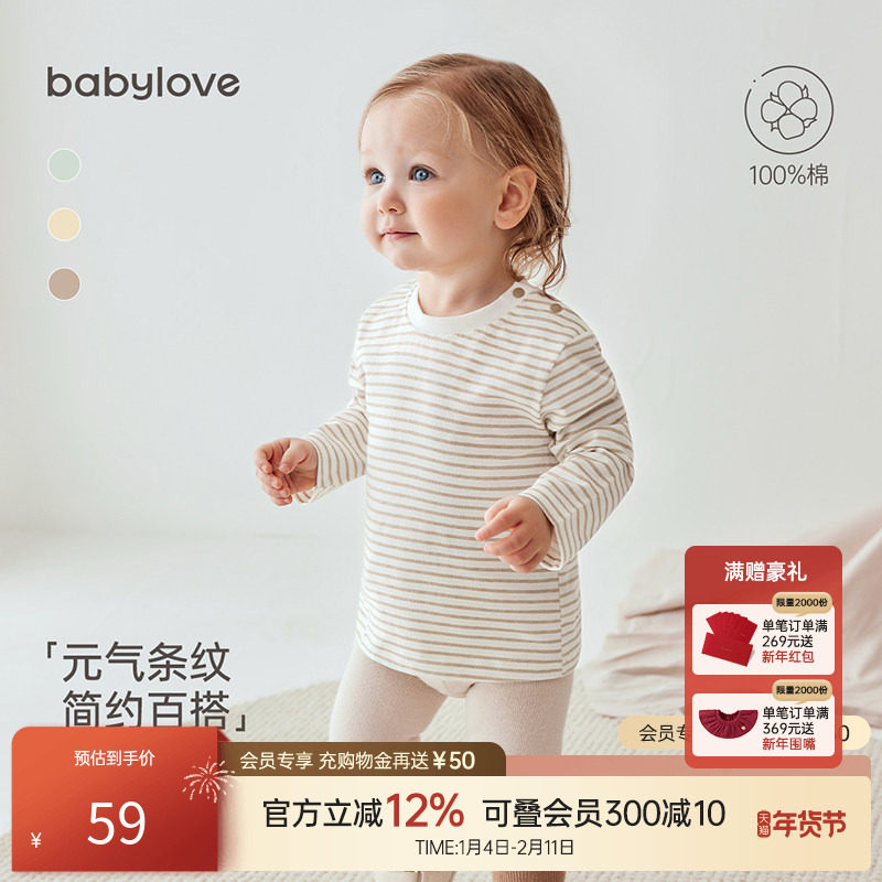 babylove婴儿T恤纯棉春秋宝宝上衣休闲打底衫条纹长袖简约百搭