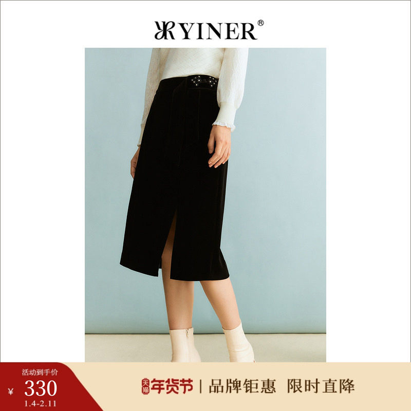 YINER音儿专选冬季女装通勤职场小黑裙设计感前开衩半身裙
