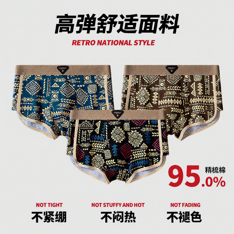 男士内裤纯棉印花抗菌舒适透气平角裤潮流个性国潮短裤衩复古高弹