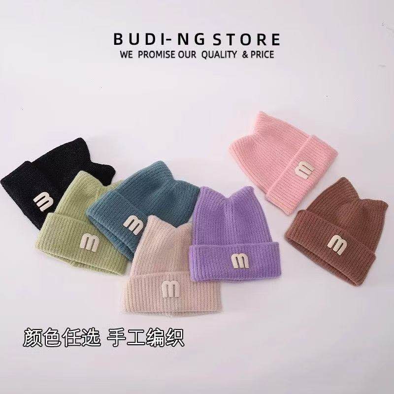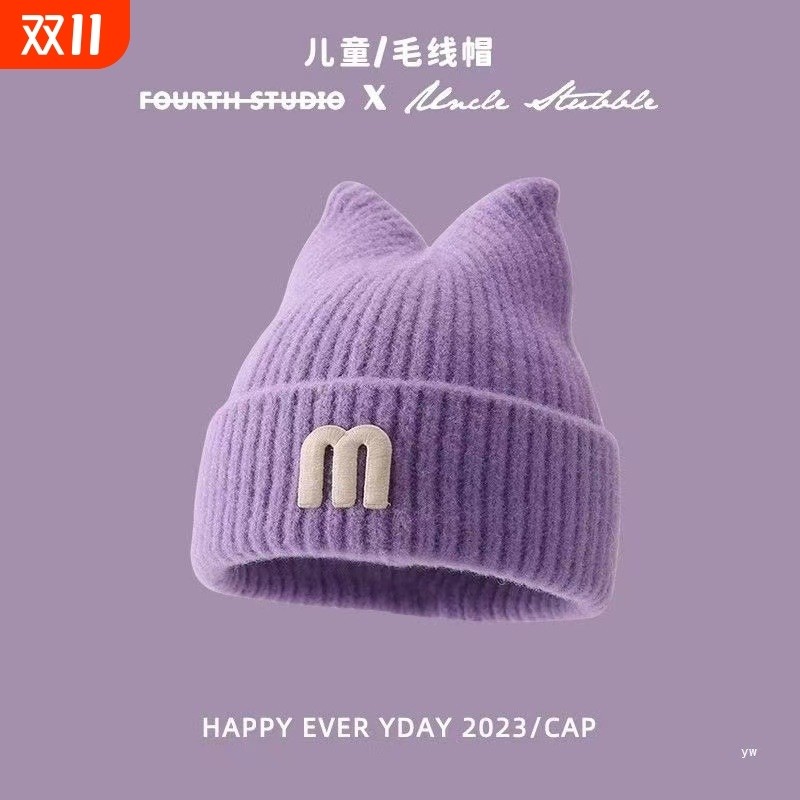 儿童护耳帽秋冬新款字母标针织帽男女宝宝加绒加厚保暖毛线帽紫色