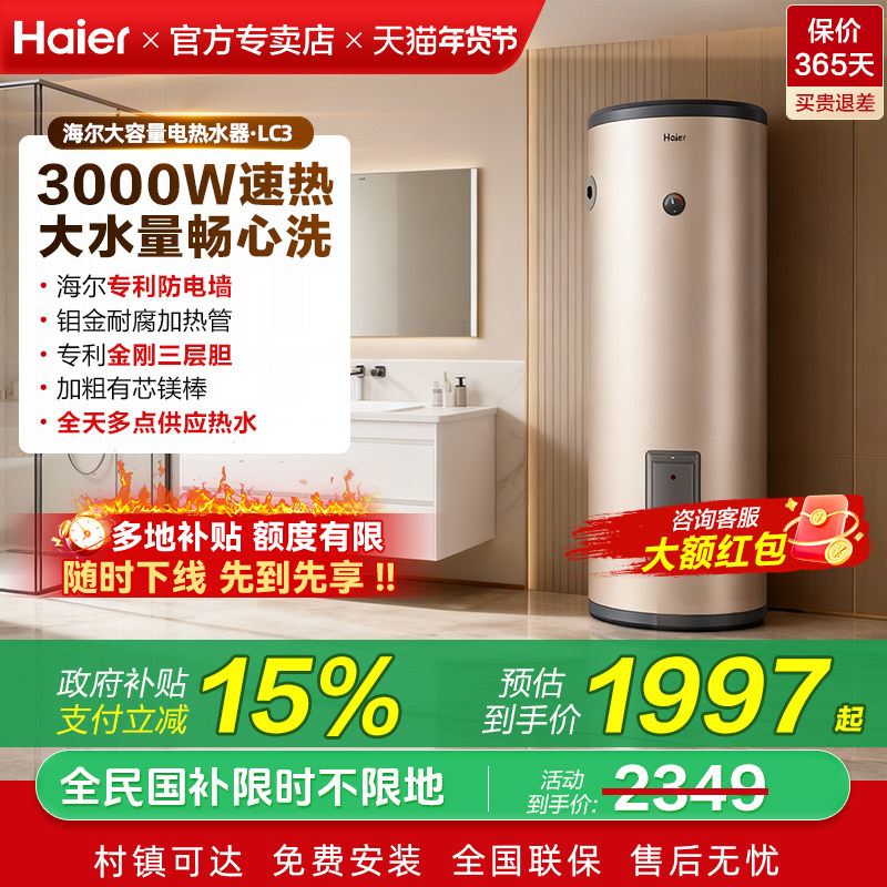 政府补贴海尔电热水器200升立式落地160L理发店竖式100L大容量LC3