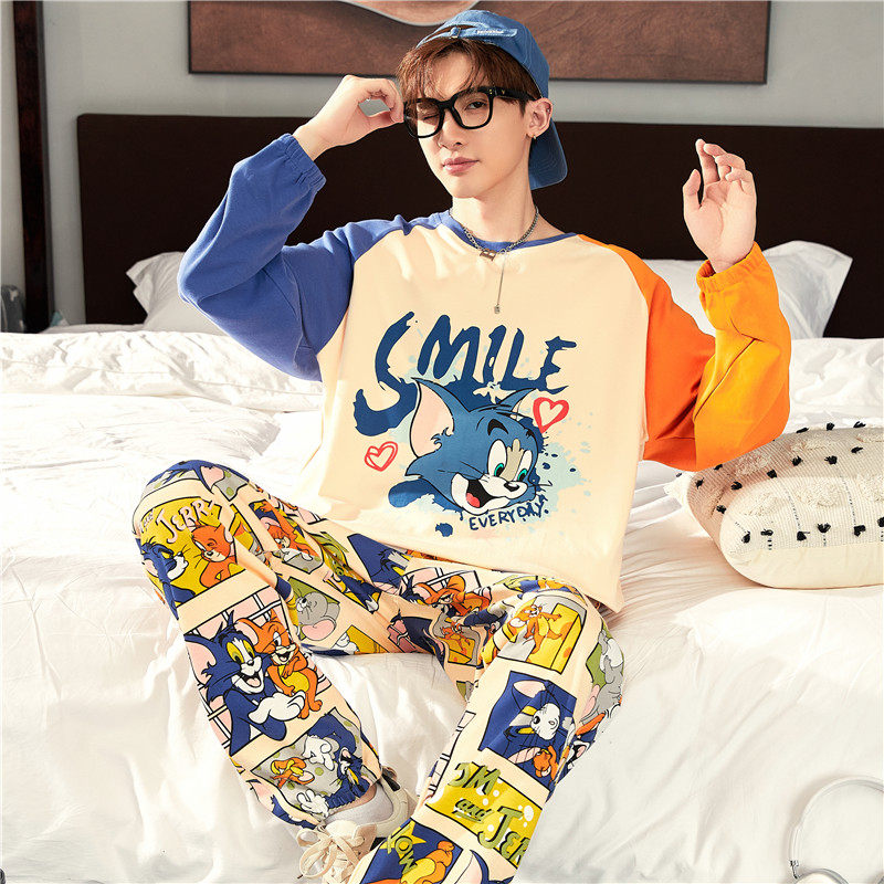 安比斯情侣睡衣舒适纯棉秋季女长袖男女同款休闲家居服套装可出门