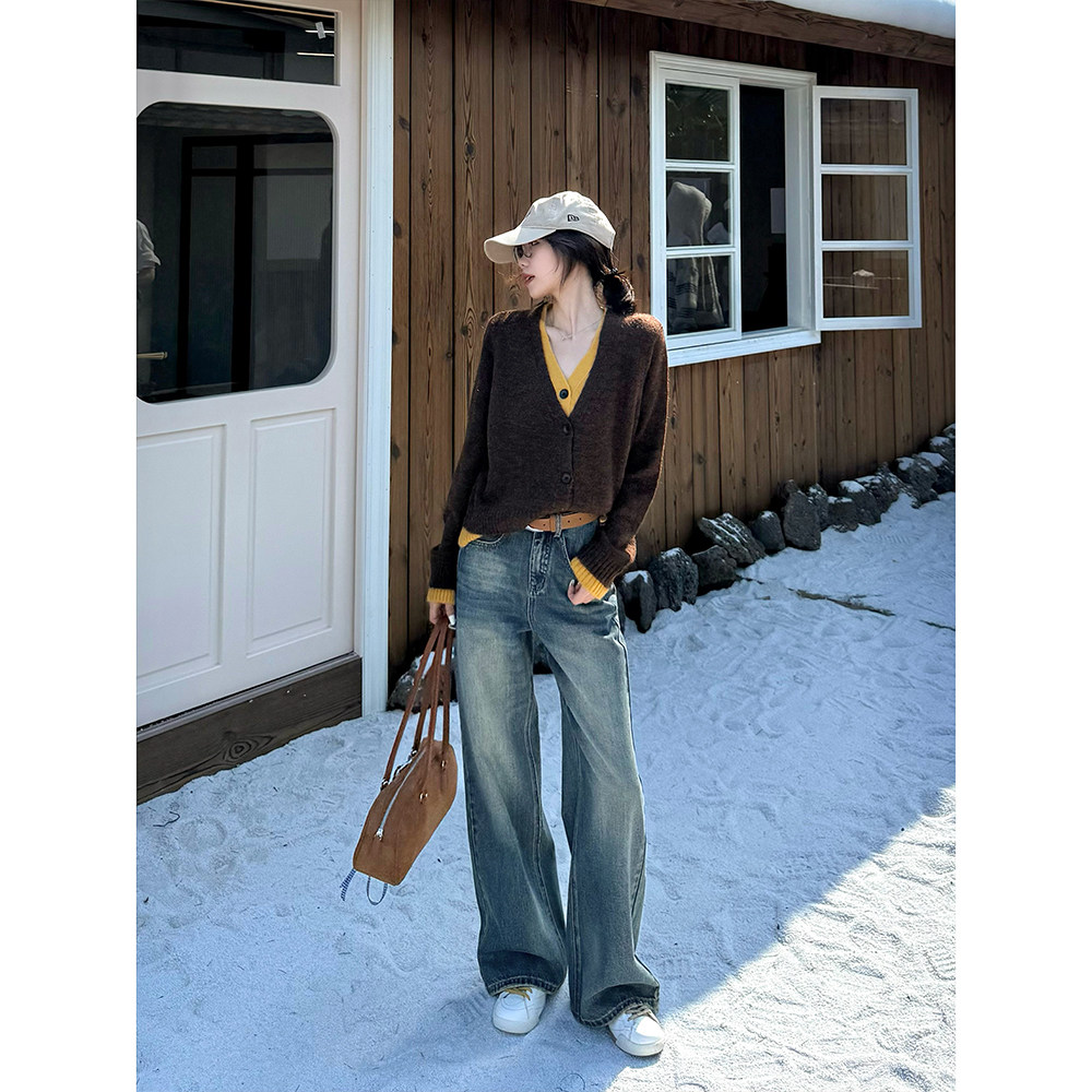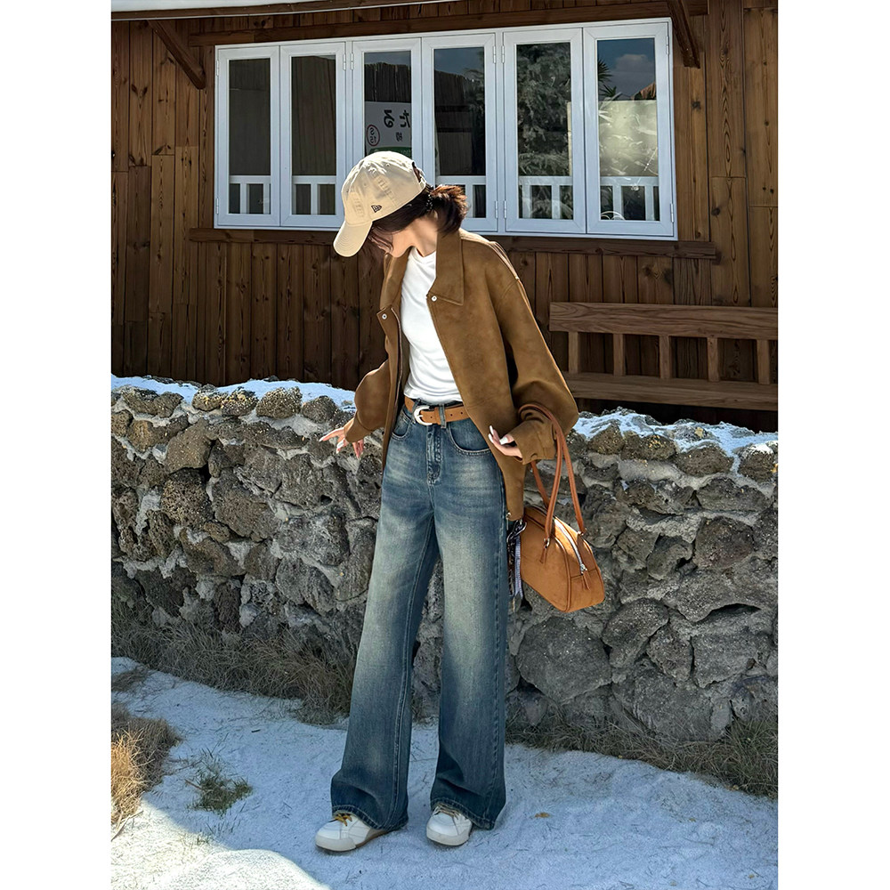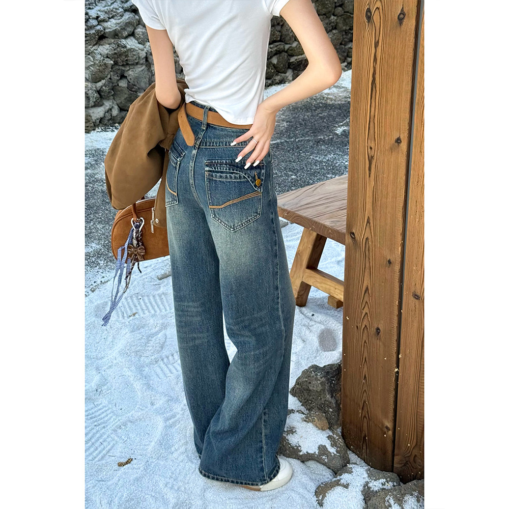 艾恩晟 2025早春美式宽松垂感牛仔阔腿裤深蓝色系慵懒风ins博主风