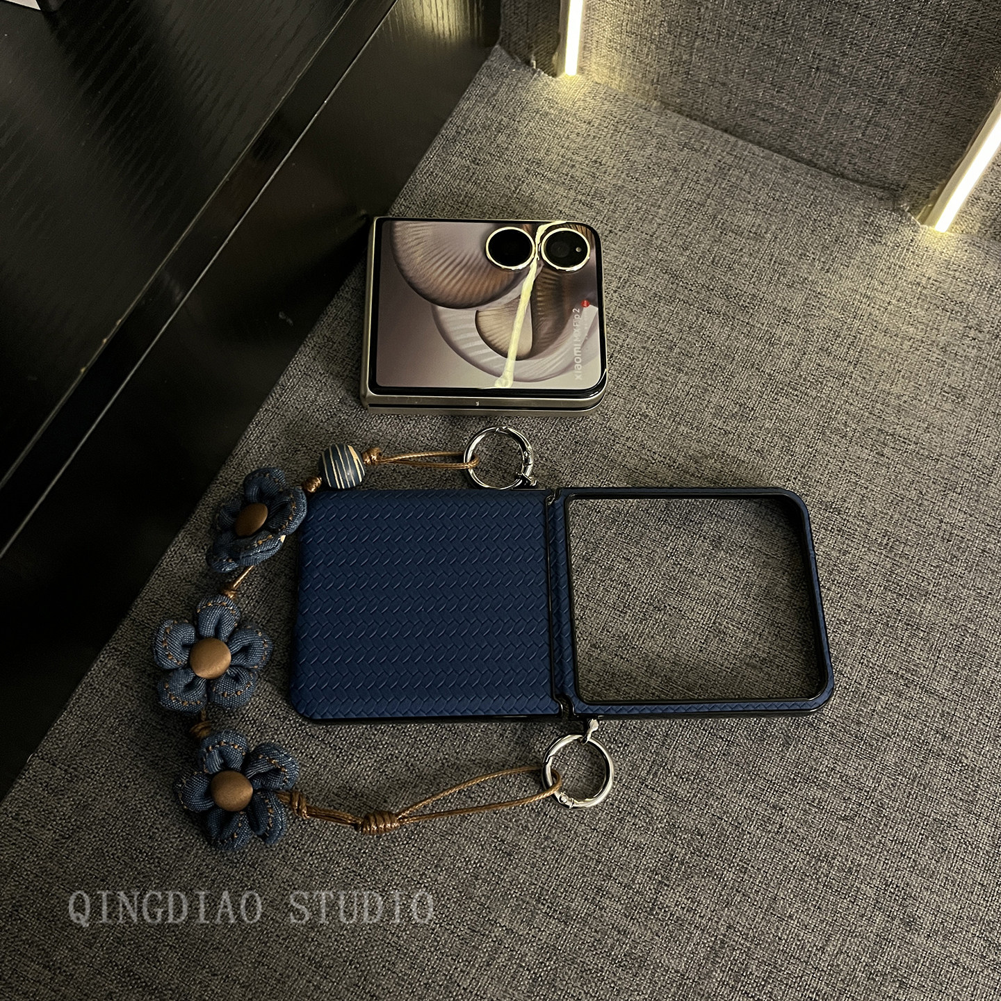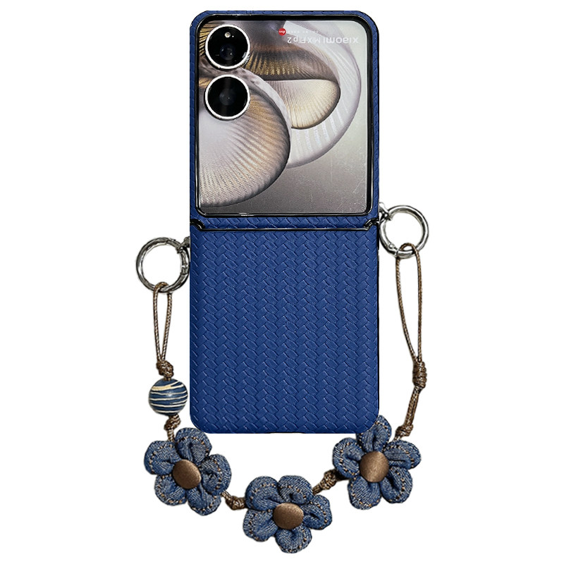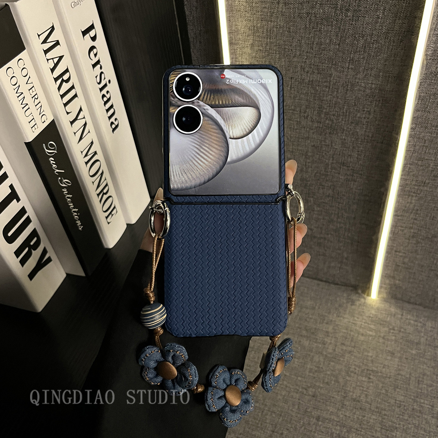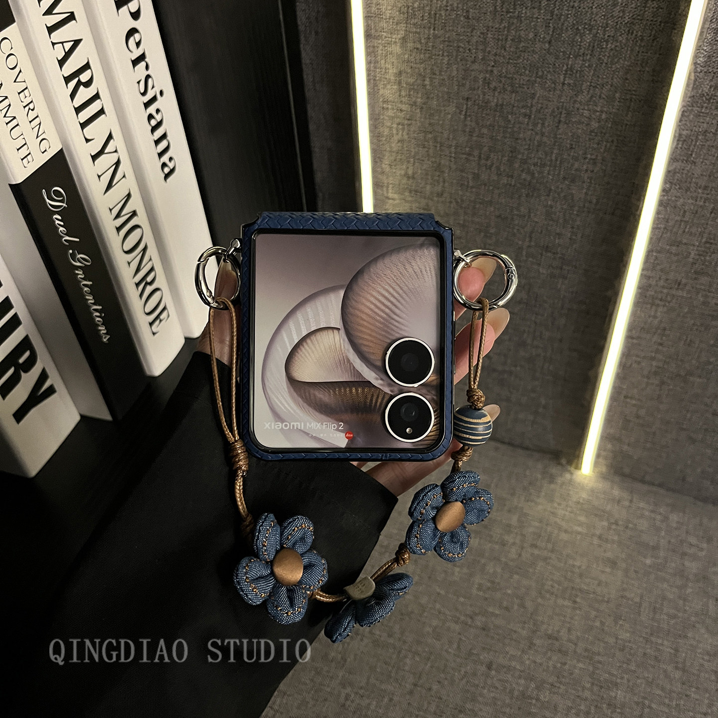 轻调 韩风深蓝草席纹牛仔花朵手提链适用于小米MIX Flip2手机壳全包新款MIX限量版flip折叠屏翻盖防摔保护套