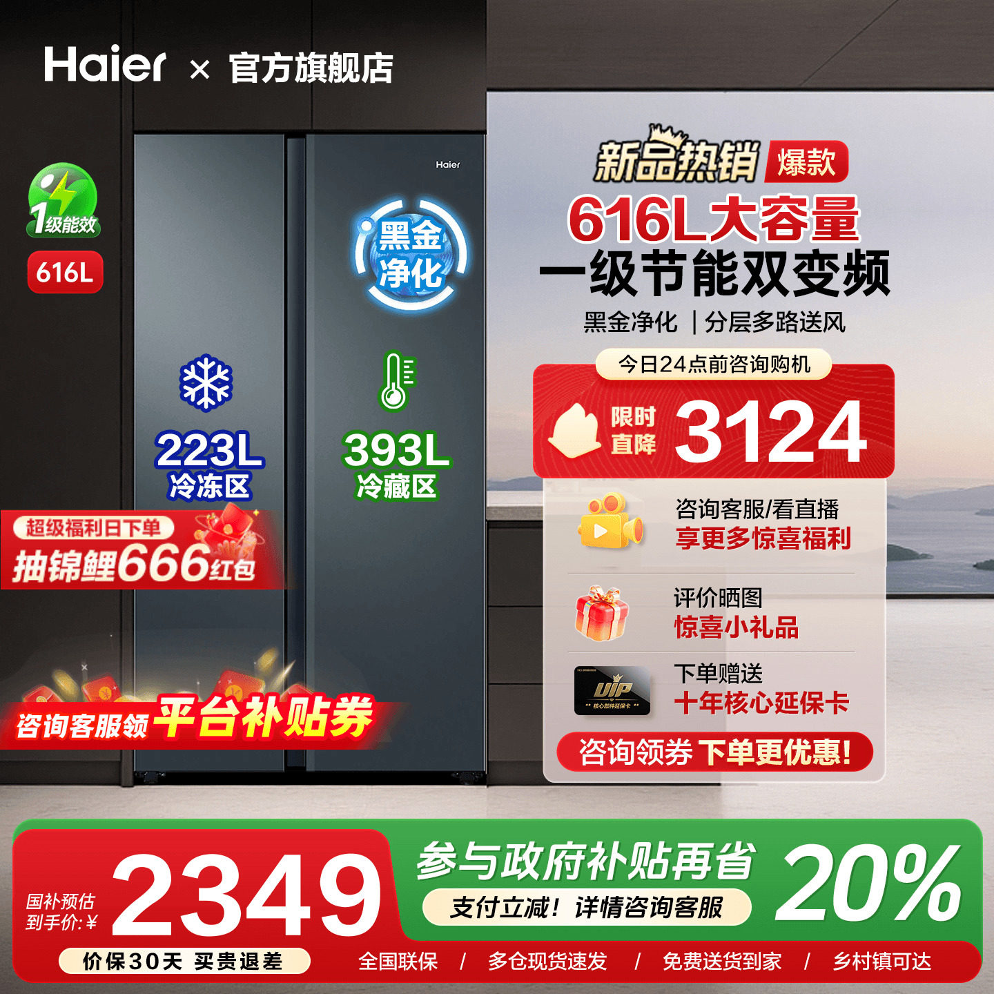 [换新补贴]海尔616L双门大冷冻容量对开门家用一级风冷无霜电冰箱