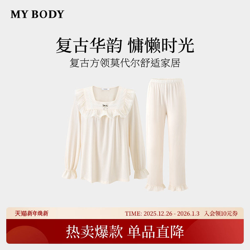 商场同款MYBODY睡衣套装女莫代尔棉舒适宽松长袖方领可外穿家居服