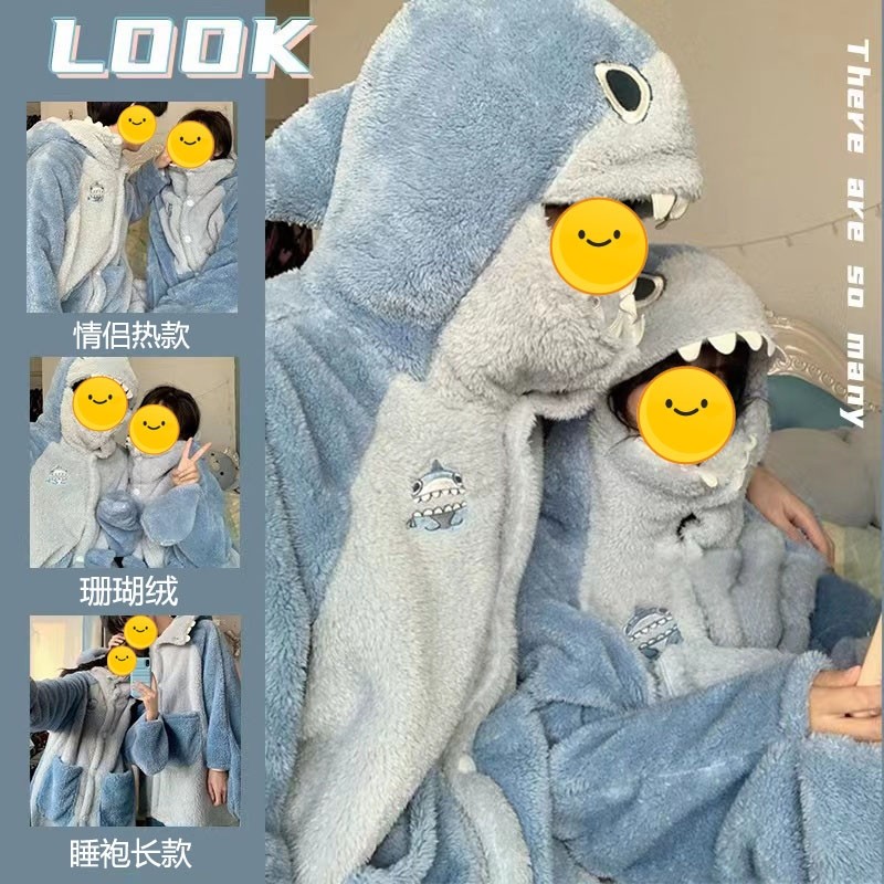 珊瑚绒睡衣女款2025新款秋冬季加厚长男士情侣鲨鱼睡袍睡裙家居服