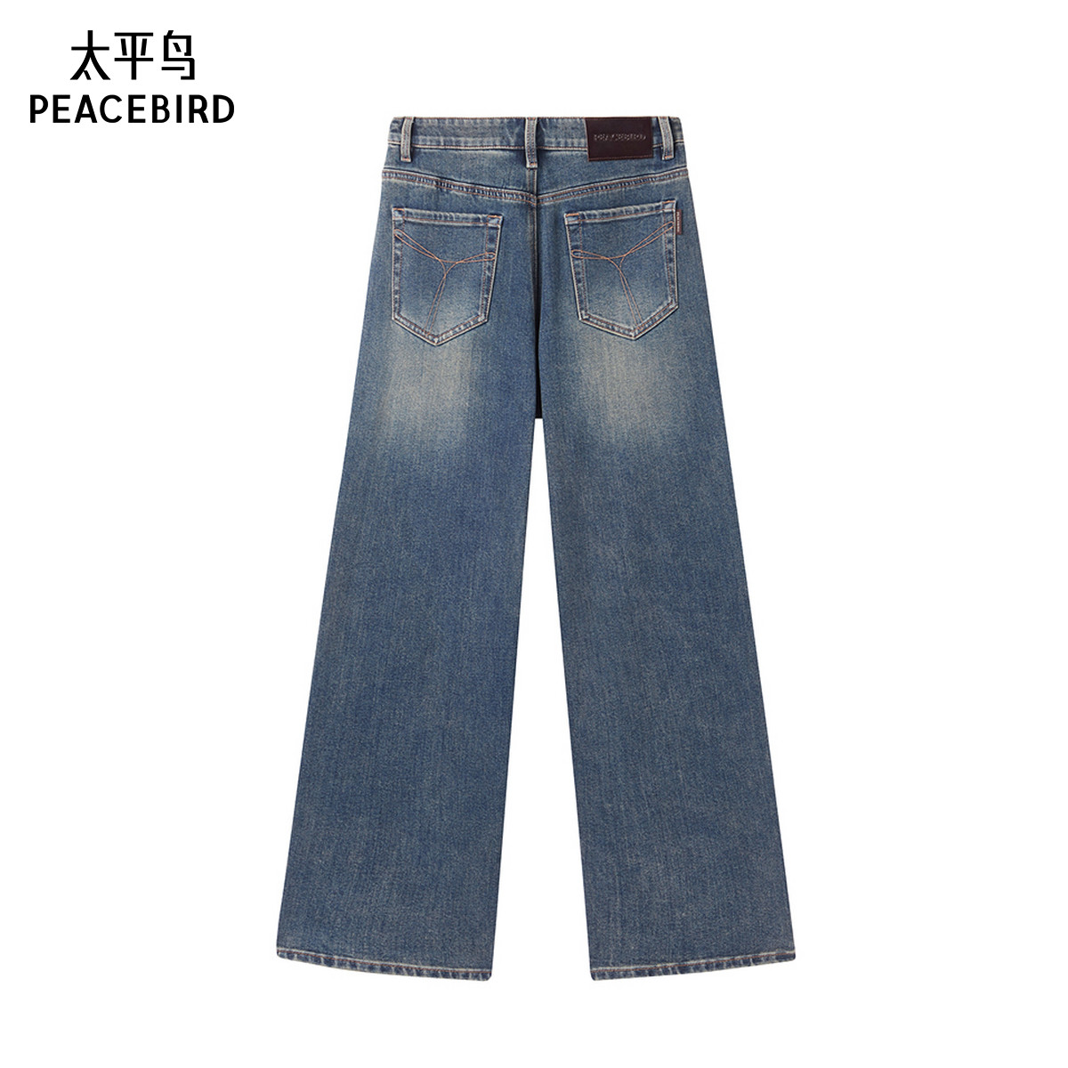 太平鸟高腰阔腿牛仔裤25年冬季复古羊毛宽松直筒牛仔裤A1HAE4444