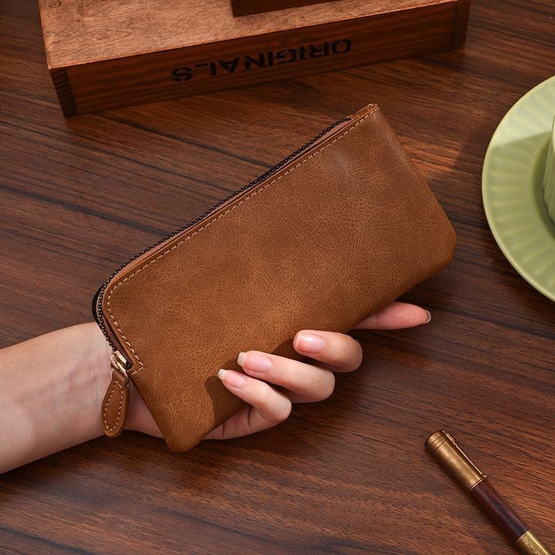 真皮质感长款钱包女复古拉链手拿零钱简约个性超薄便携卡包收纳包