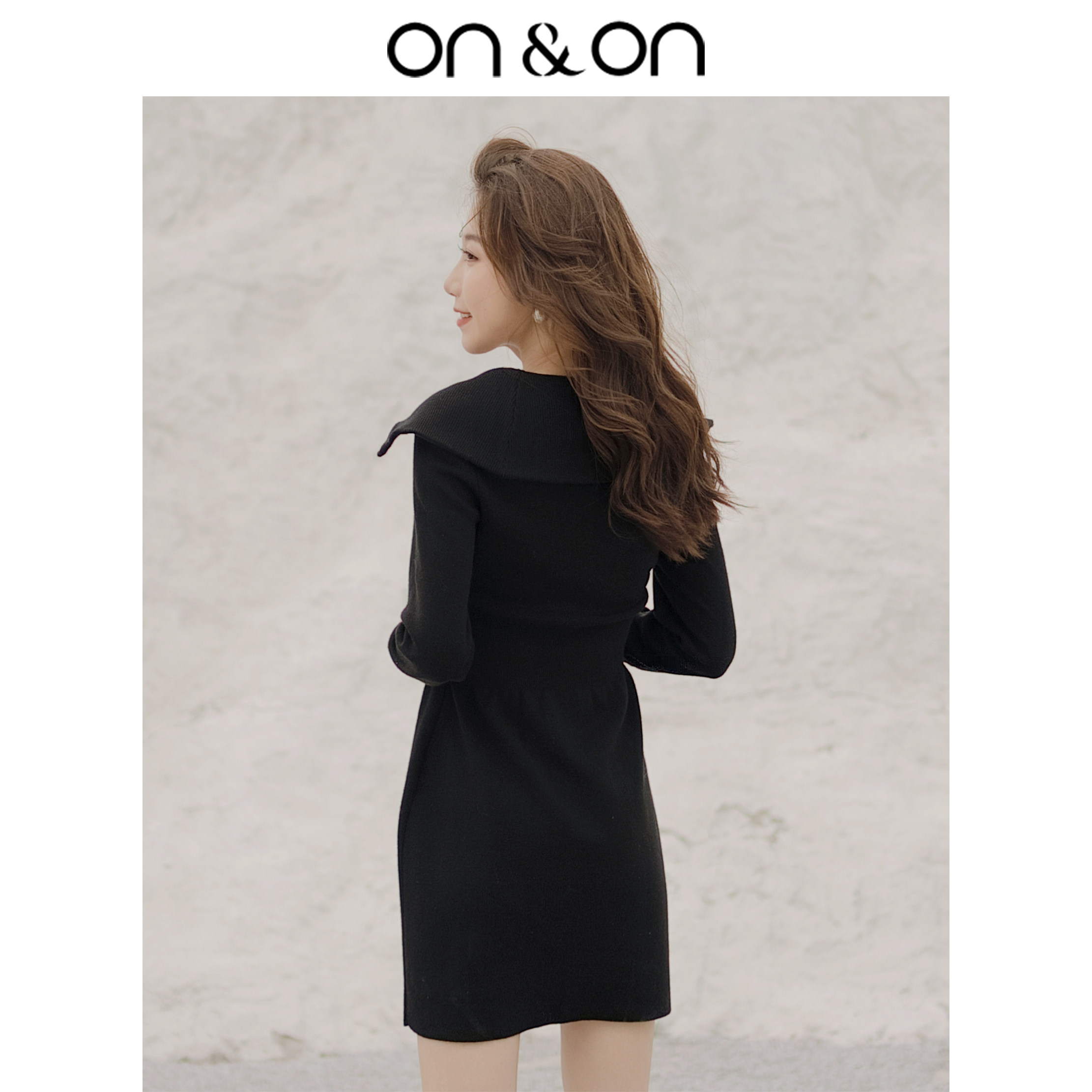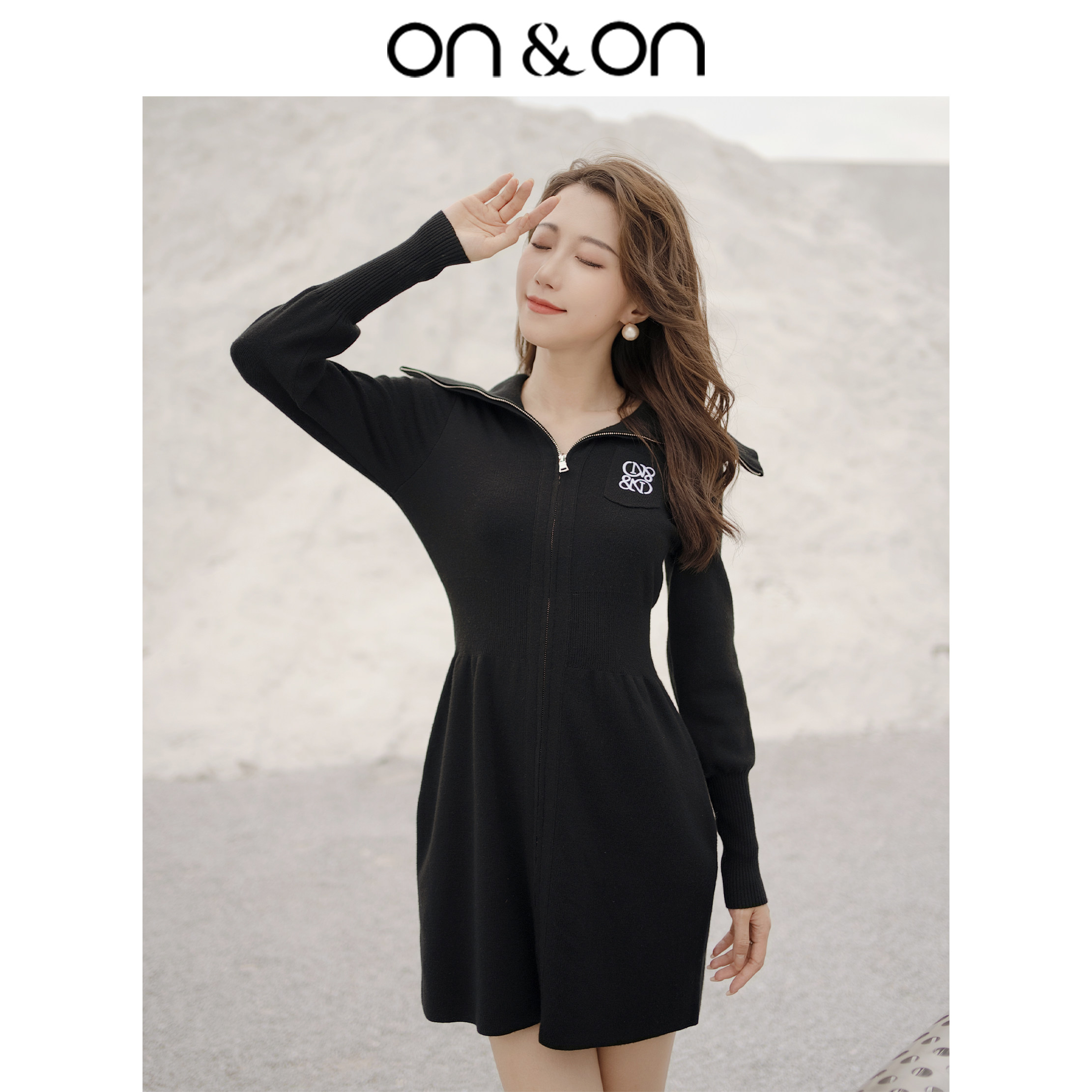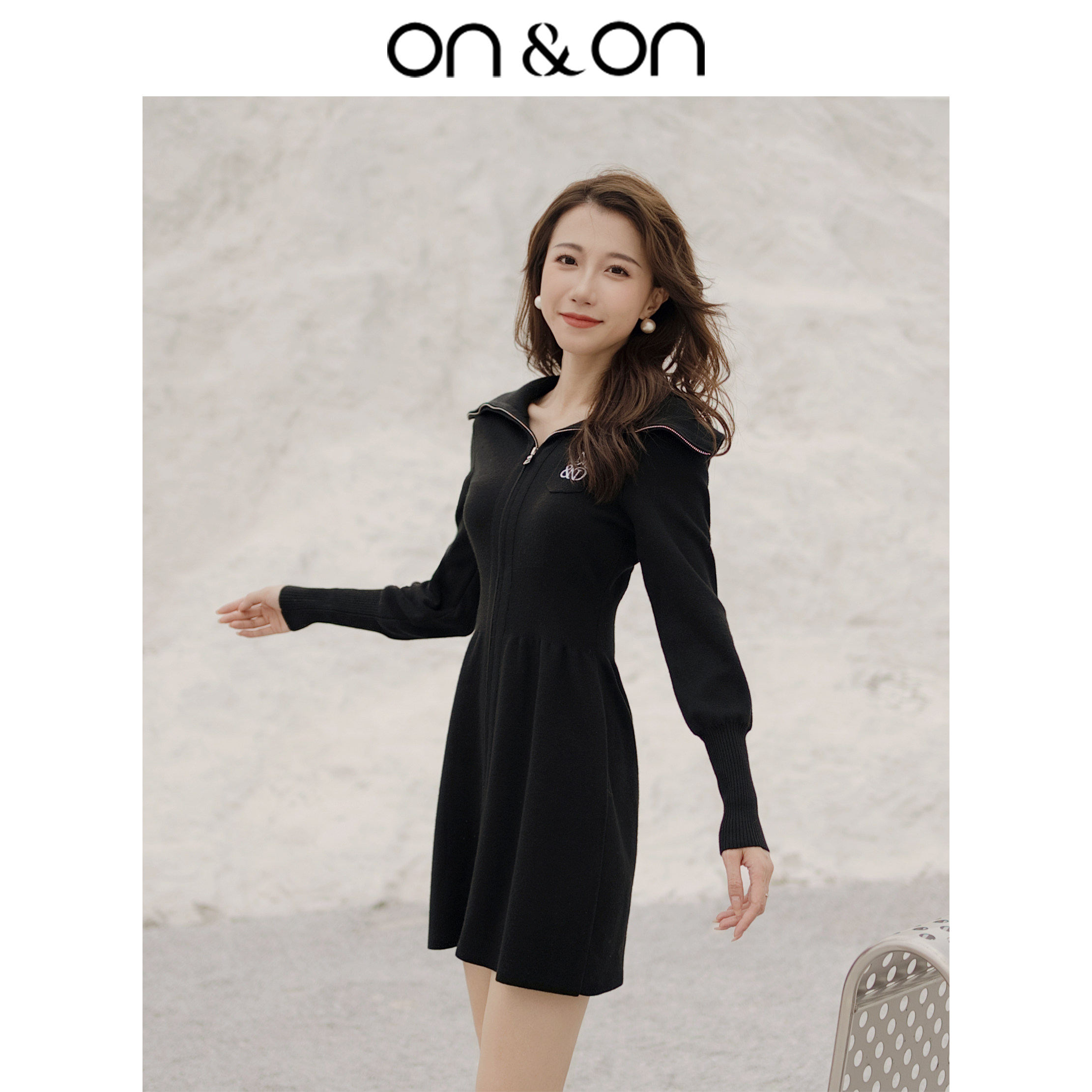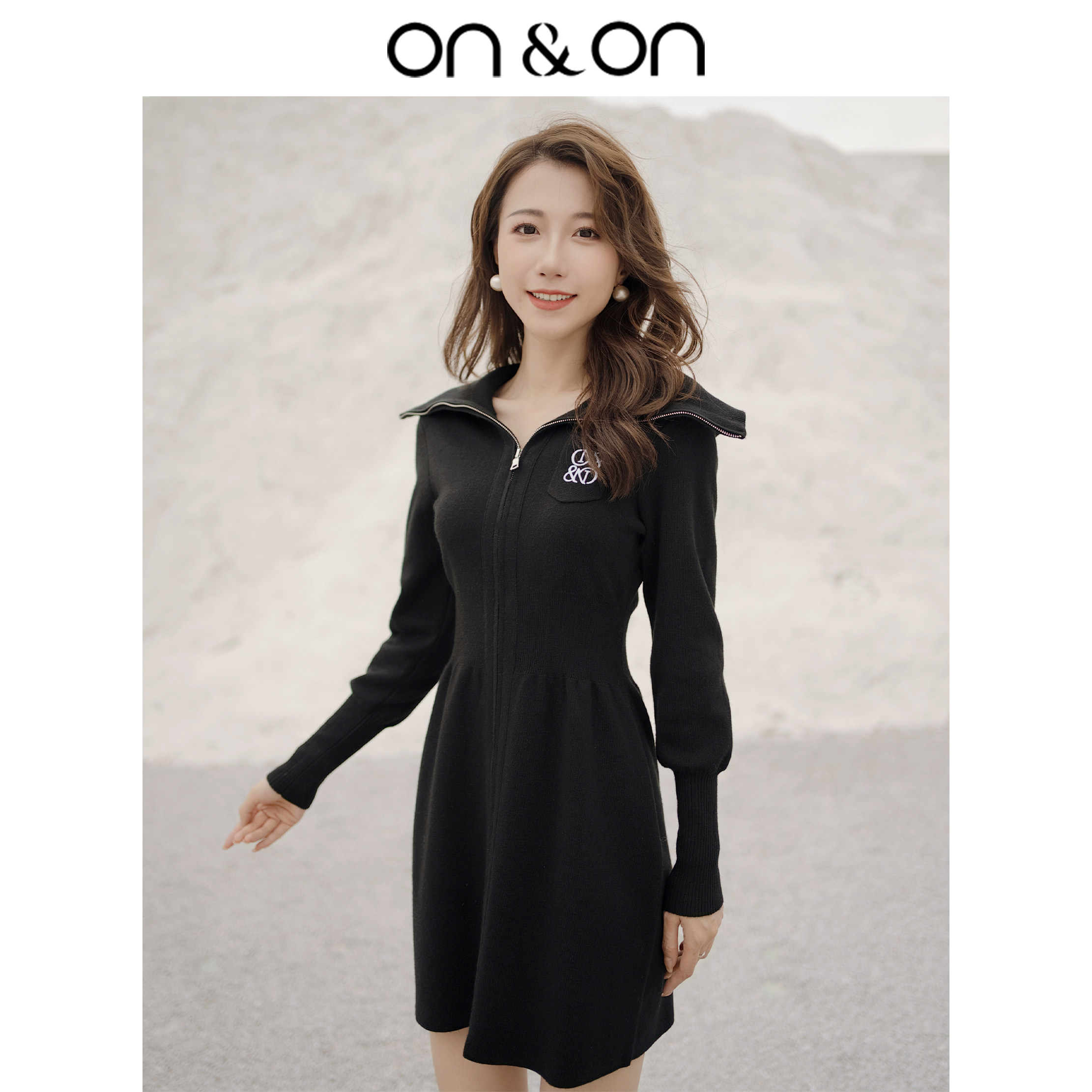 ON&ON/安乃安冬季新款韩式翻领刺绣收腰修身显瘦羊毛针织连衣裙