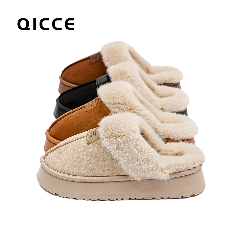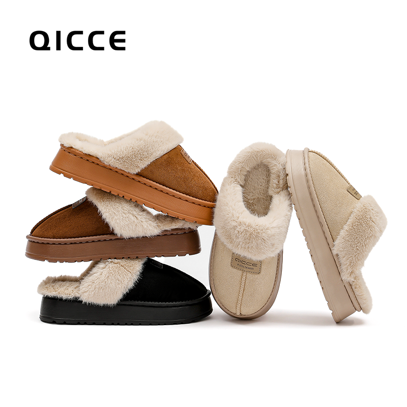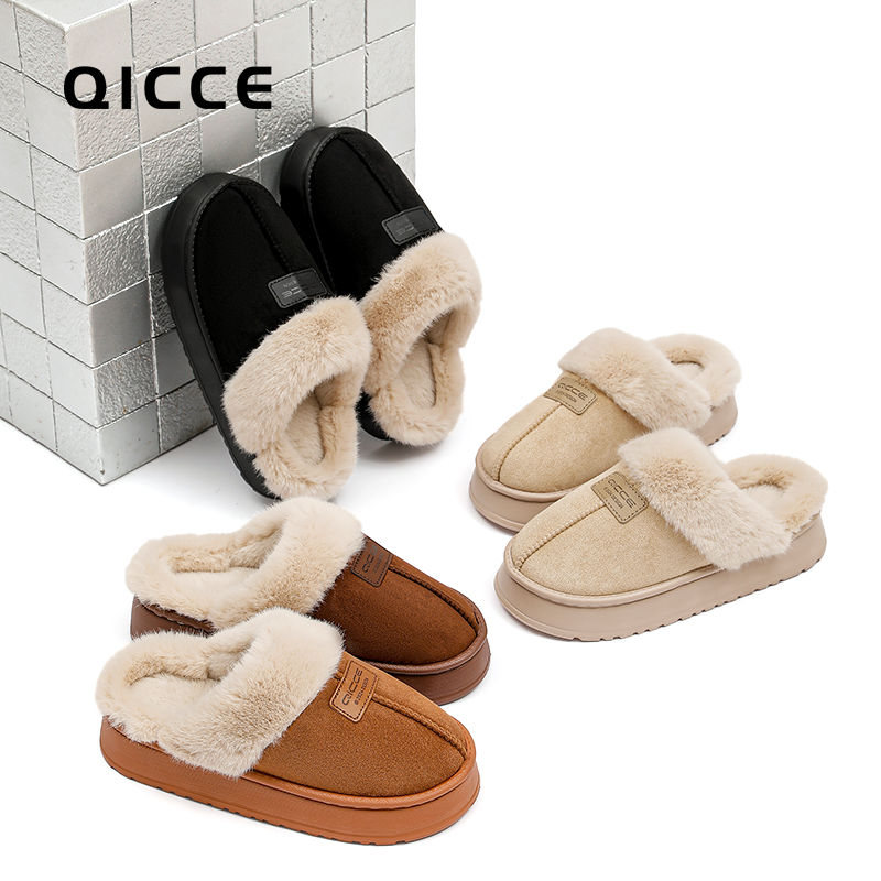 轻臣2025新款翻半包跟棉拖加绒保暖情侣外穿毛毛绒厚底黑色复古