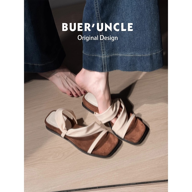 真皮~骄屿法式复古坡跟两穿露趾凉鞋女新款一字带方头露趾凉拖鞋