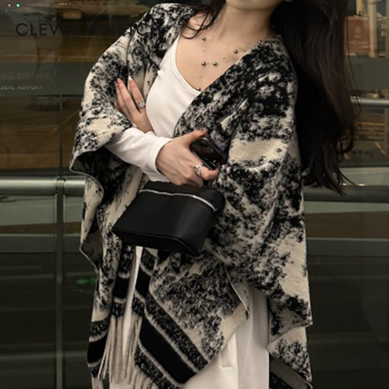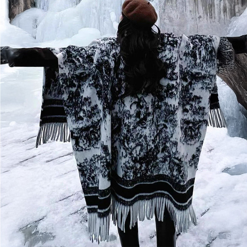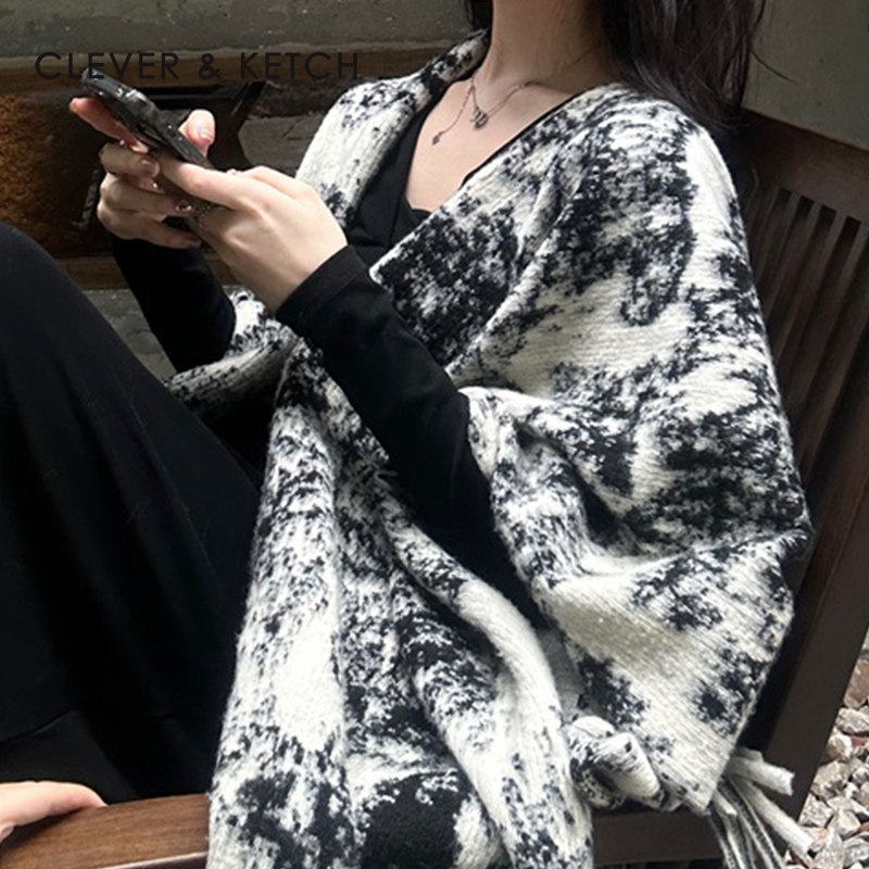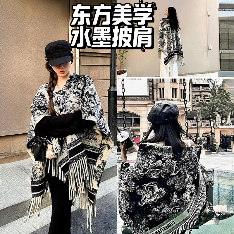 水墨风复古保暖围巾女冬季高级感厚新中式格子披肩斗篷外搭氛围感