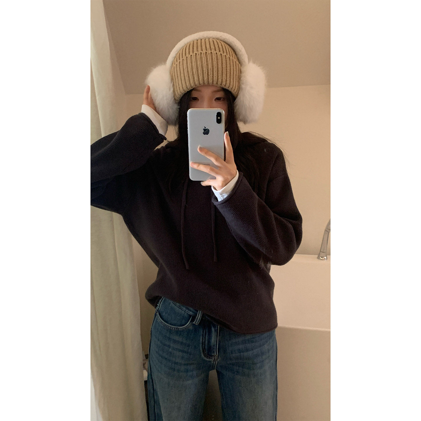加厚版!慵懒风白色连帽水貂绒套头毛衣女秋装新款韩版宽松针织衫