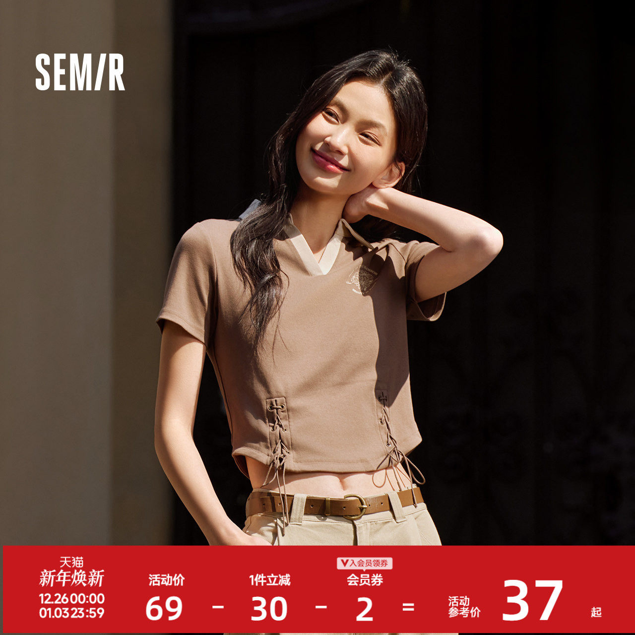 森马POLO衫女短款设计感绑带美式复古辣妹夏季修身印花上衣小心机