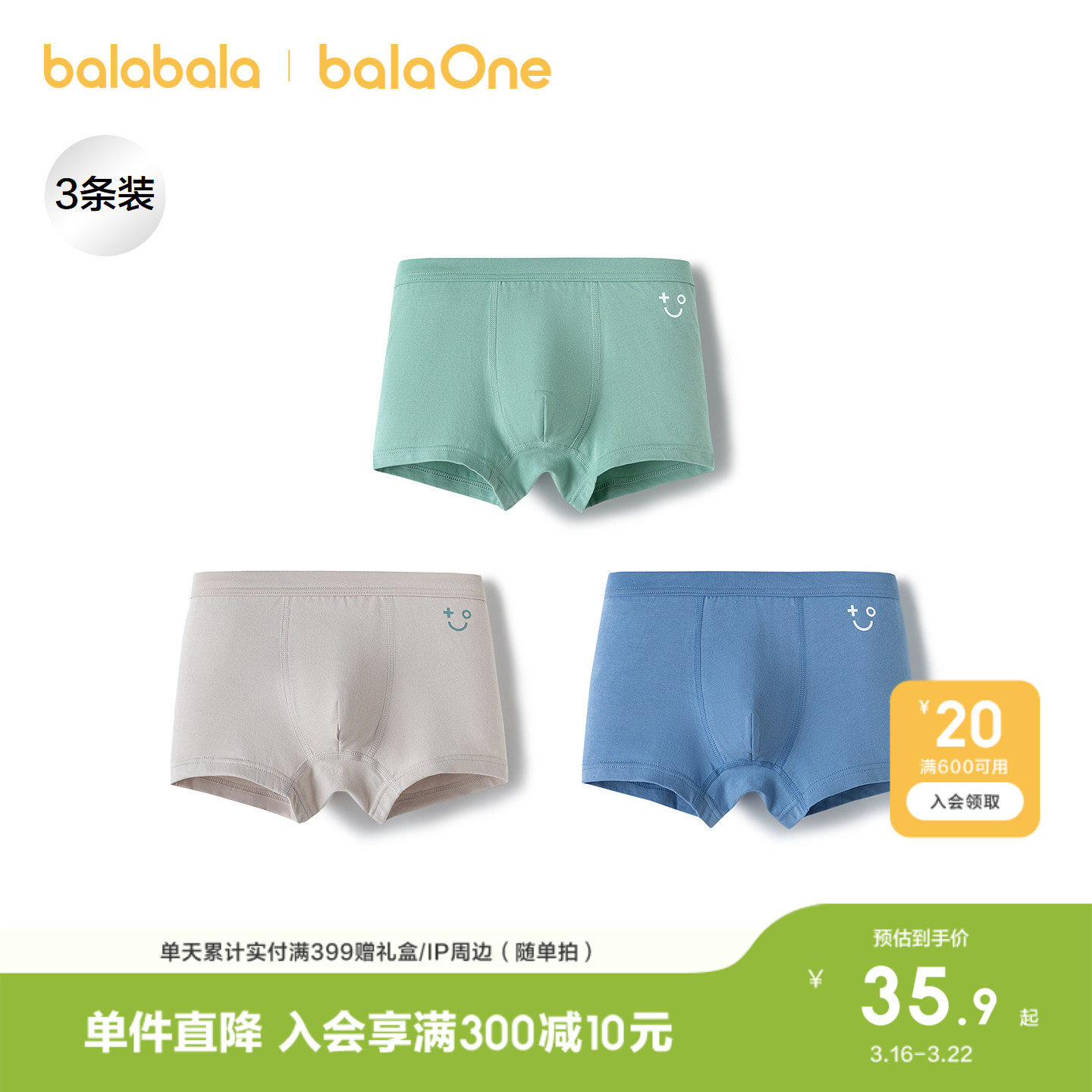 【balaOne】巴拉巴拉儿童内裤棉男童不夹pp抗菌裆四角短裤三条装