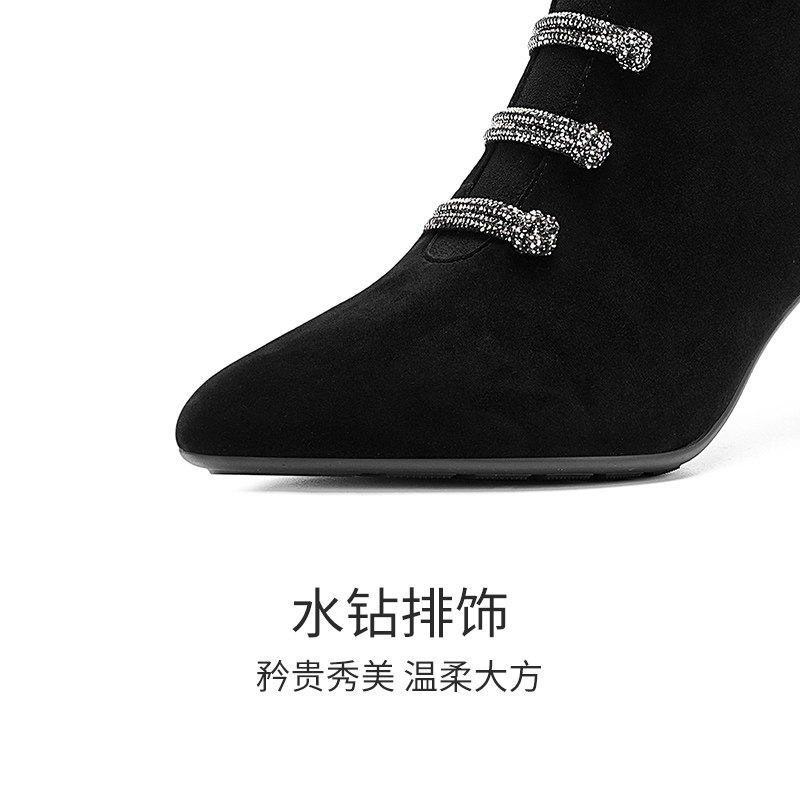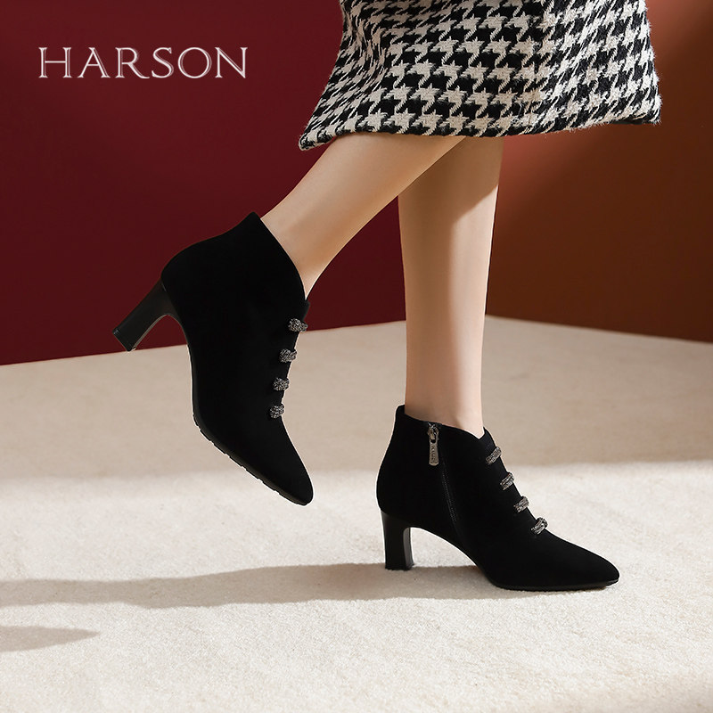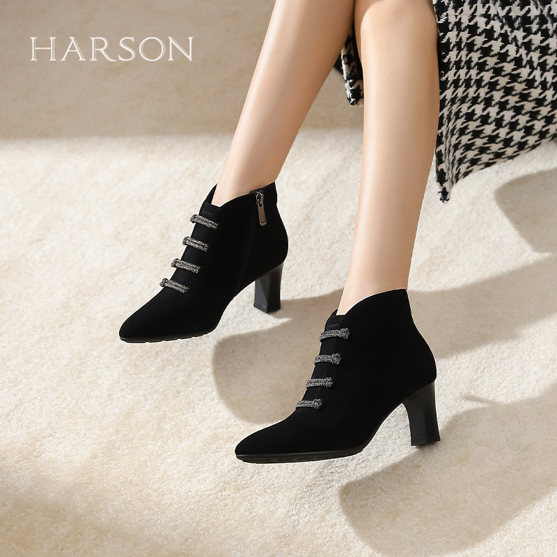 哈森粗踝靴女秋冬季单靴新款冬季尖头羊反绒时装短靴HA247918