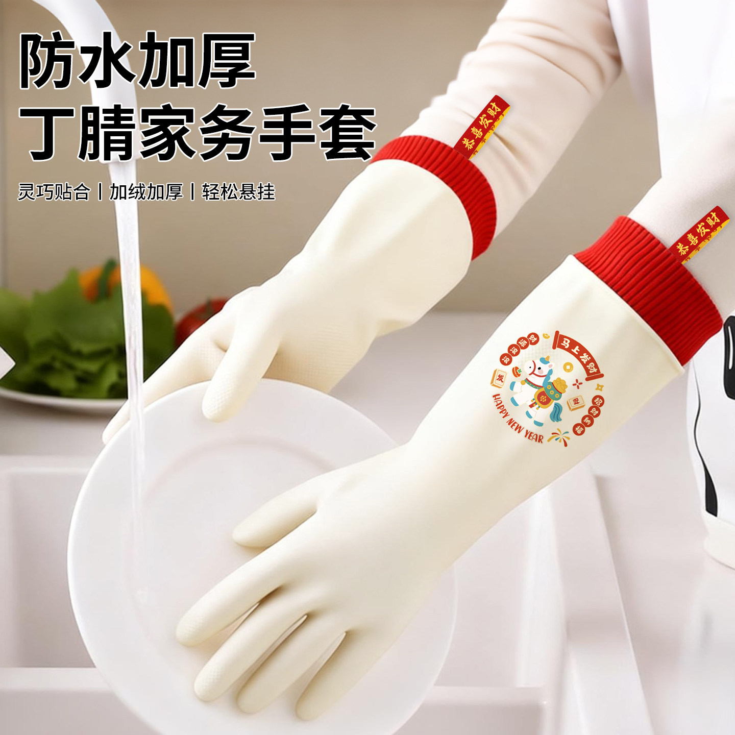 丁腈手套家务洗碗厨房植绒耐用食品级加绒橡胶洗衣服刷碗清洁防水