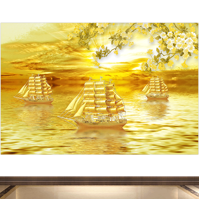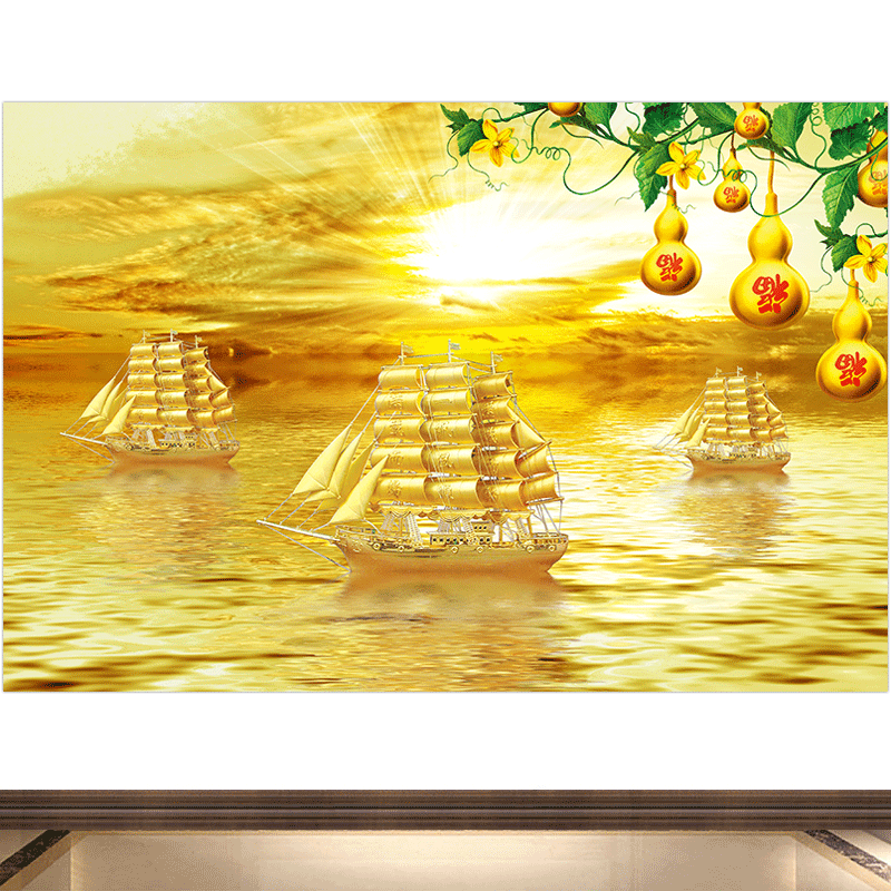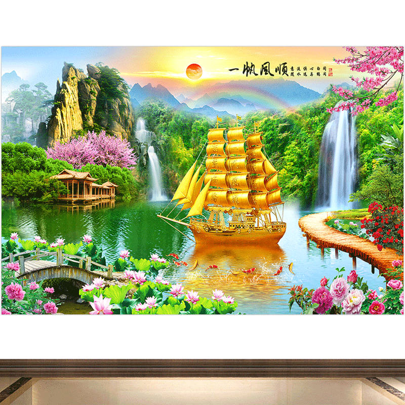 自粘画一帆风顺金帆船顺风顺水风水画背靠金山装饰画中堂招财聚财