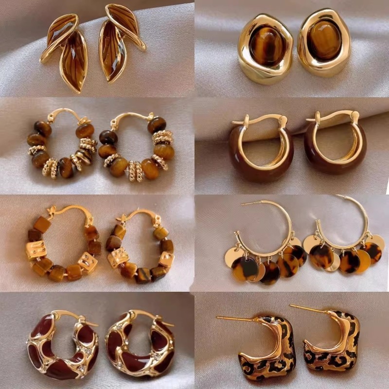 欧美跨境复古咖色耳扣轻奢美拉德风时尚耳环女高级感耳饰品虎眼石