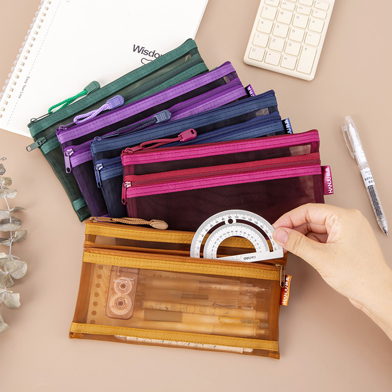A6双层文件袋复古色系网纱笔袋小学生简约铅笔袋大容量高颜值户口本护照收纳袋零钱充电器耳机线护照a6拉链袋