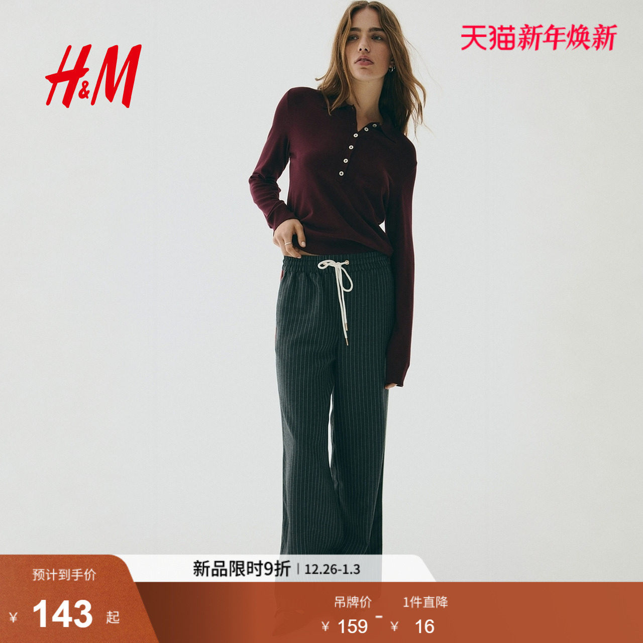 HM女装毛针织衫冬季新款新年毛衣酒红色长袖Polo打底衫1301236