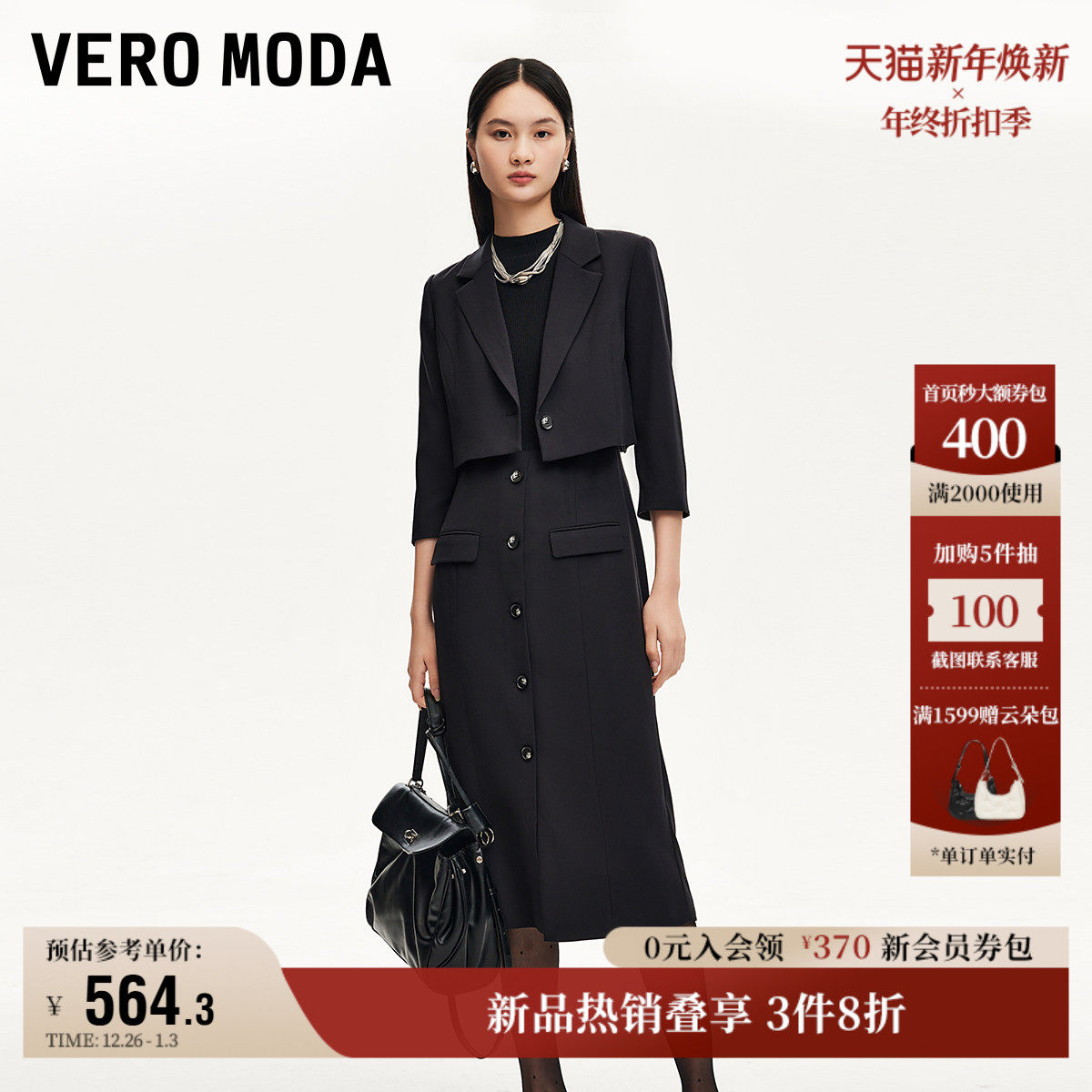 Vero Moda奥莱连衣裙秋冬新款商场同款两件套拼接小黑裙西装外套