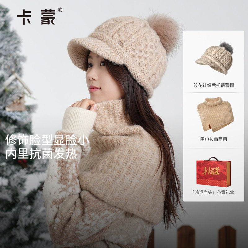 卡蒙帽子女士冬可爱毛球针织帽加厚保暖贝雷帽防风防寒护耳毛线帽