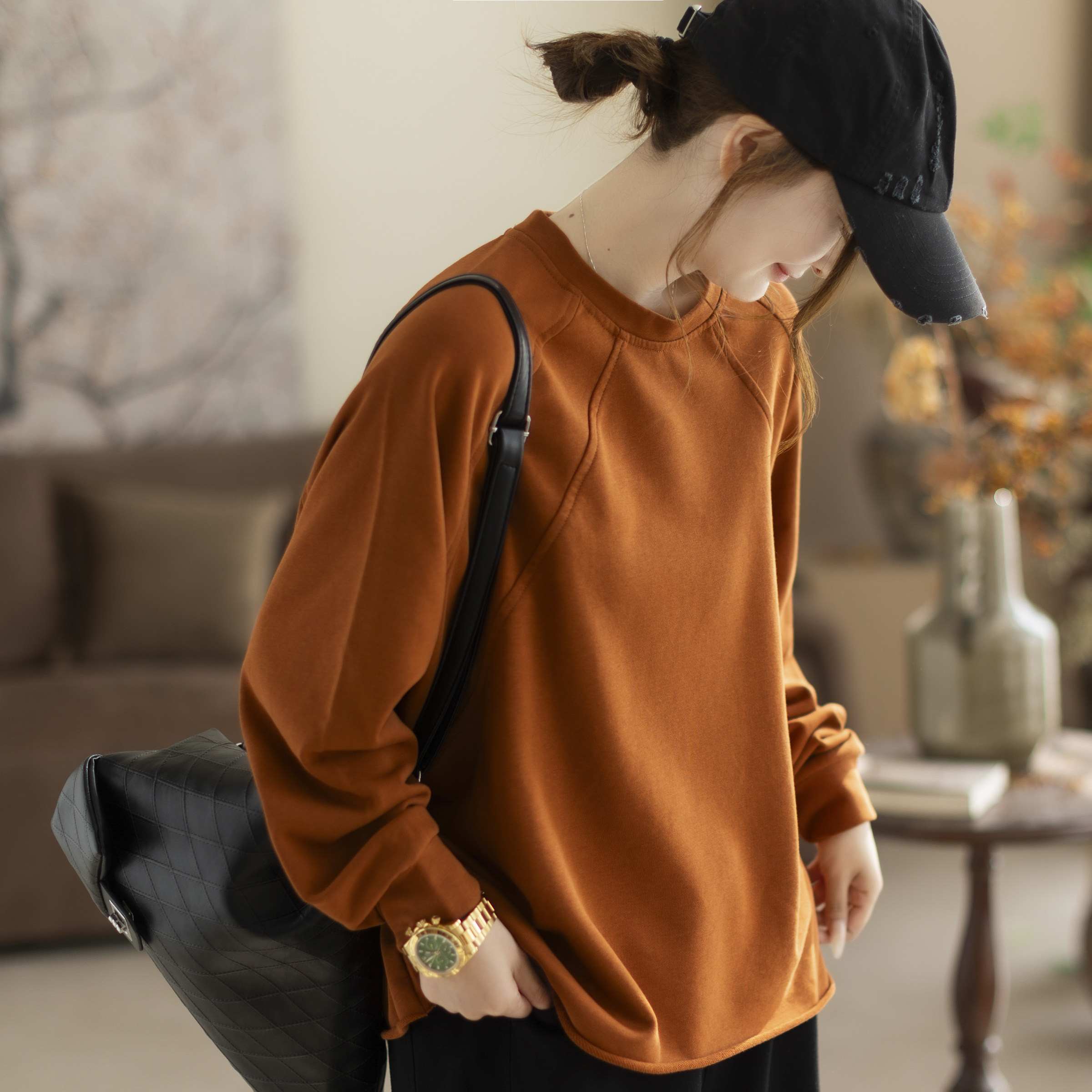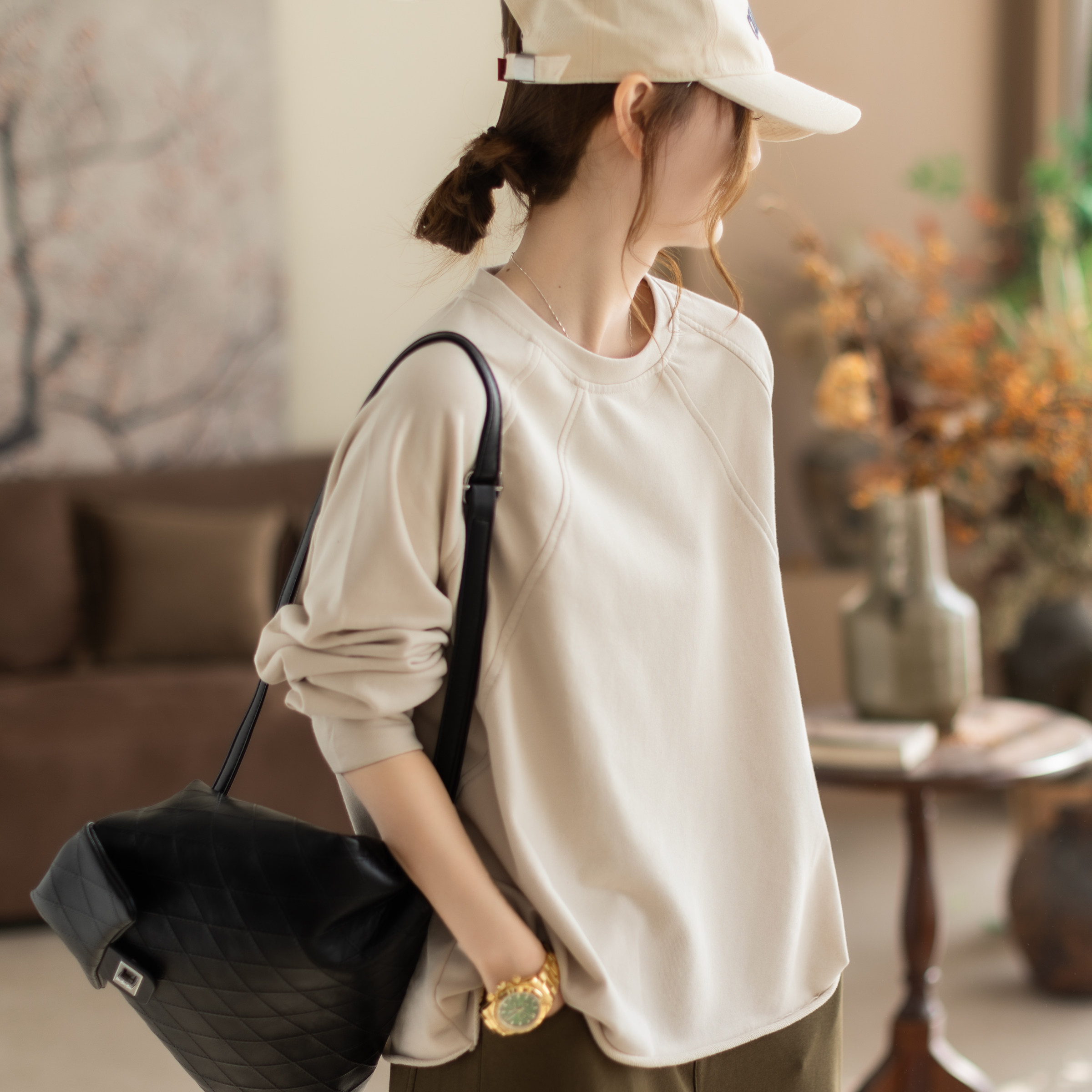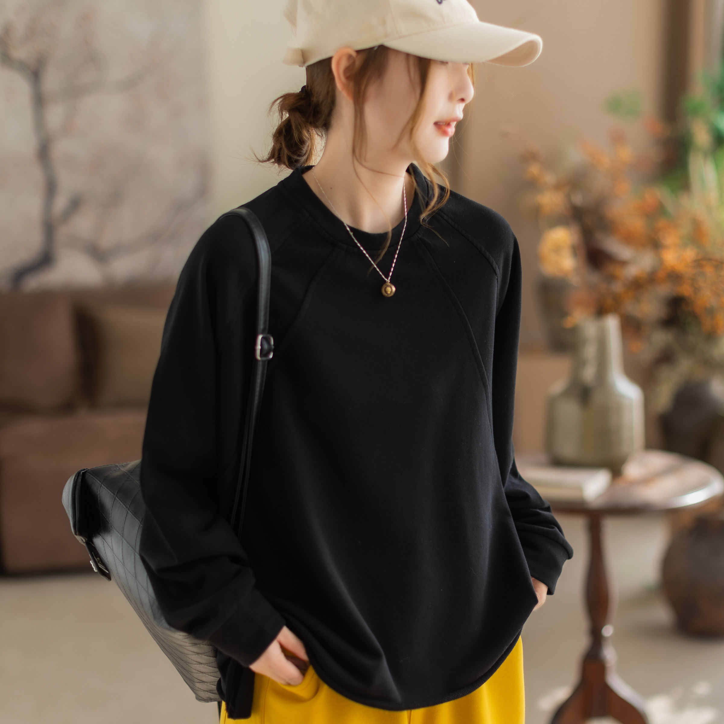 咖咪羽卫衣女春季新款圆领纯色女士棉质宽松通勤气质显瘦女装上衣