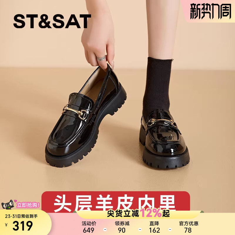 星期六厚底乐福鞋女款新款女鞋亮面英伦风小皮鞋女一脚蹬黑色单鞋