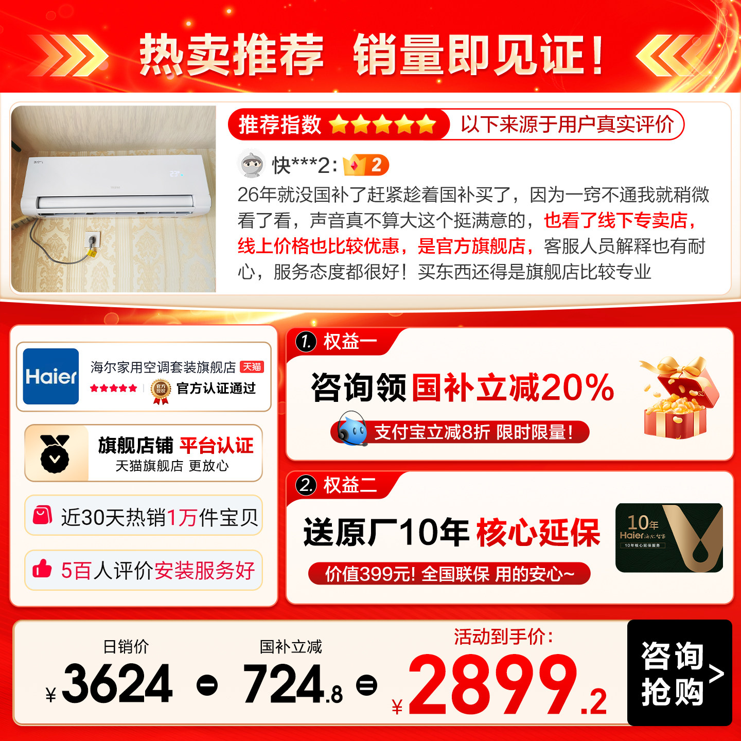 【纯铜管】海尔空调1.5匹1匹家用一级变频冷暖挂机净省电E1旗舰店
