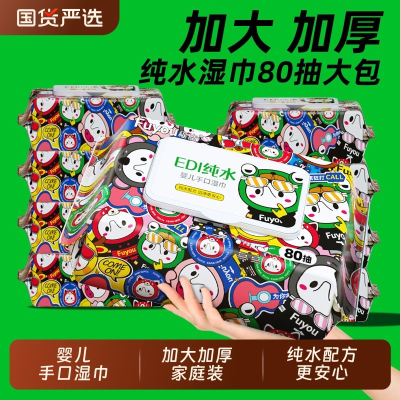 福佑婴儿手口纯水湿巾湿纸巾80抽5包大包宝宝加大加厚母婴家庭装