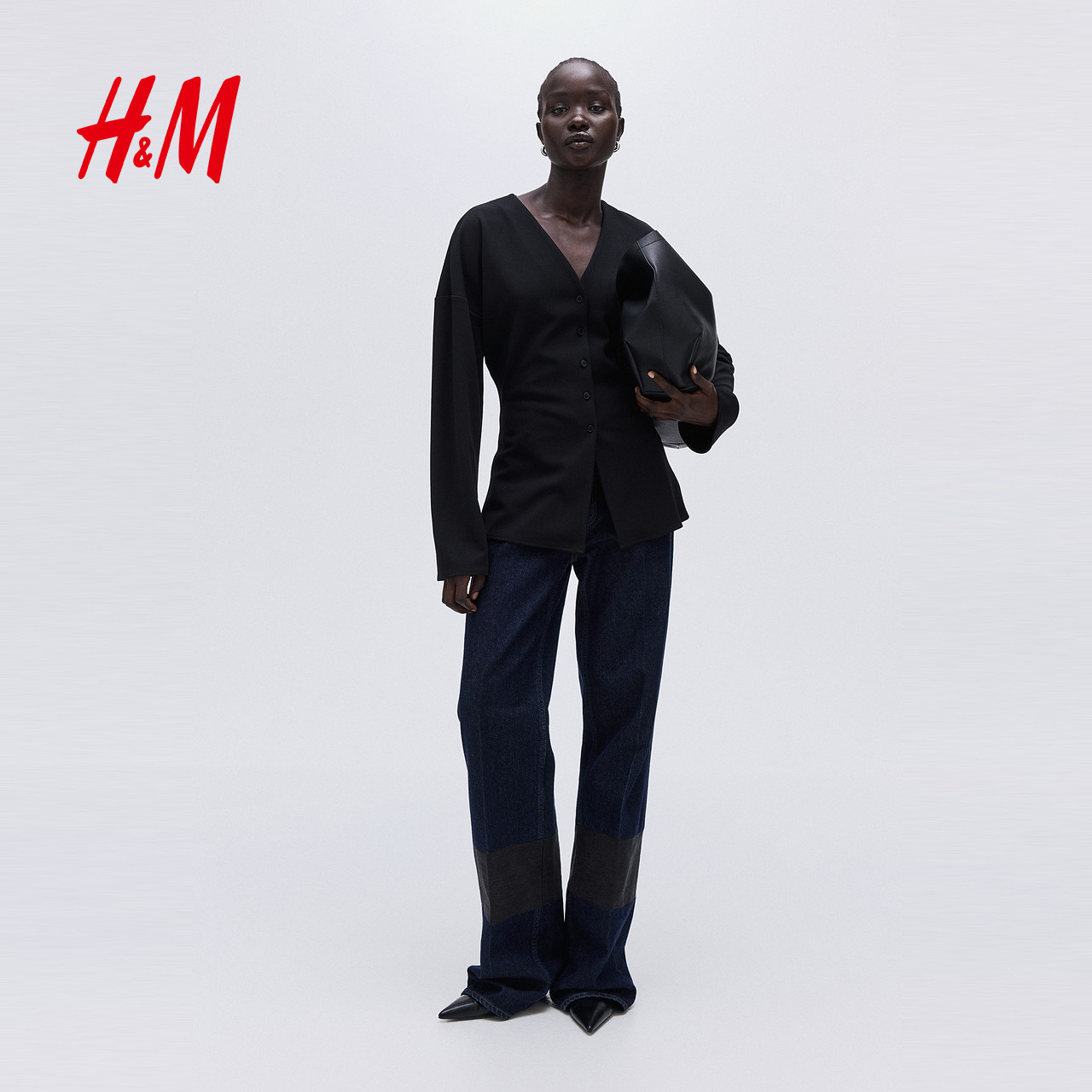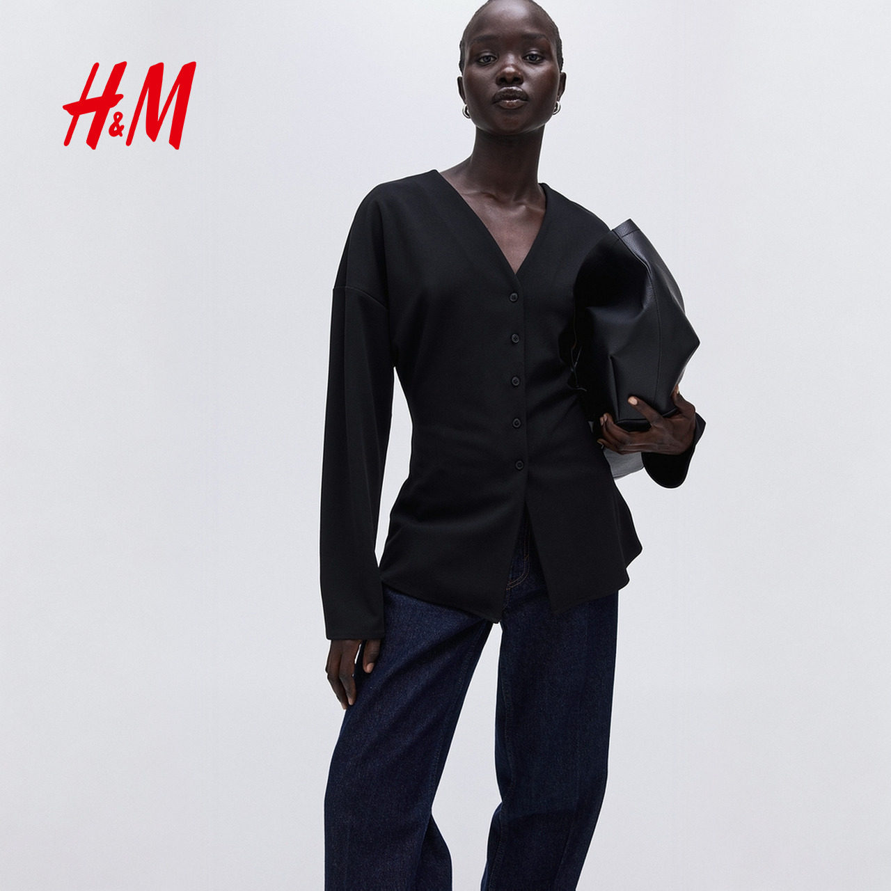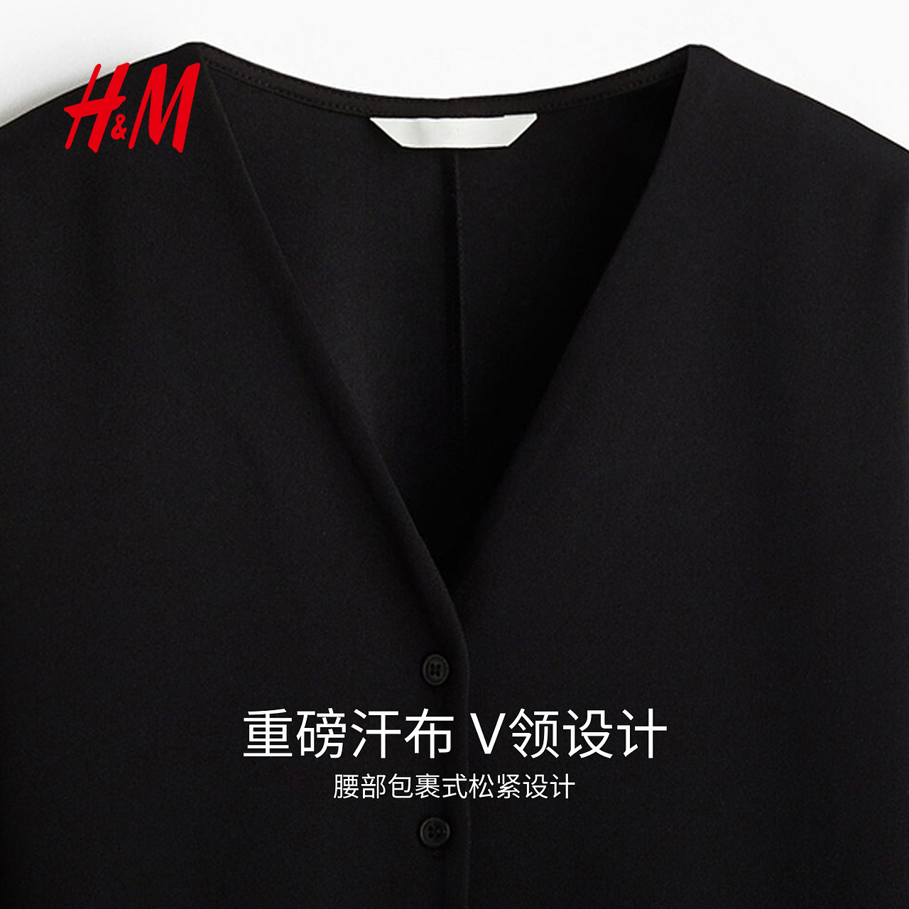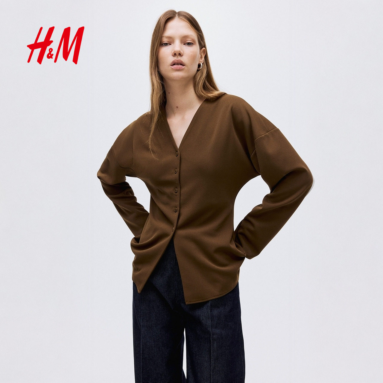 HM女装衬衫春季V领正面系扣酒红色气质衬衣上衣1310073