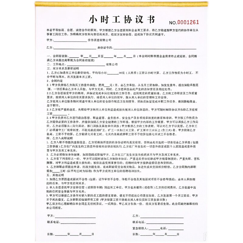 劳务派遣小时工用工协议二联钟点工雇佣协议书临时工劳动合同定制
