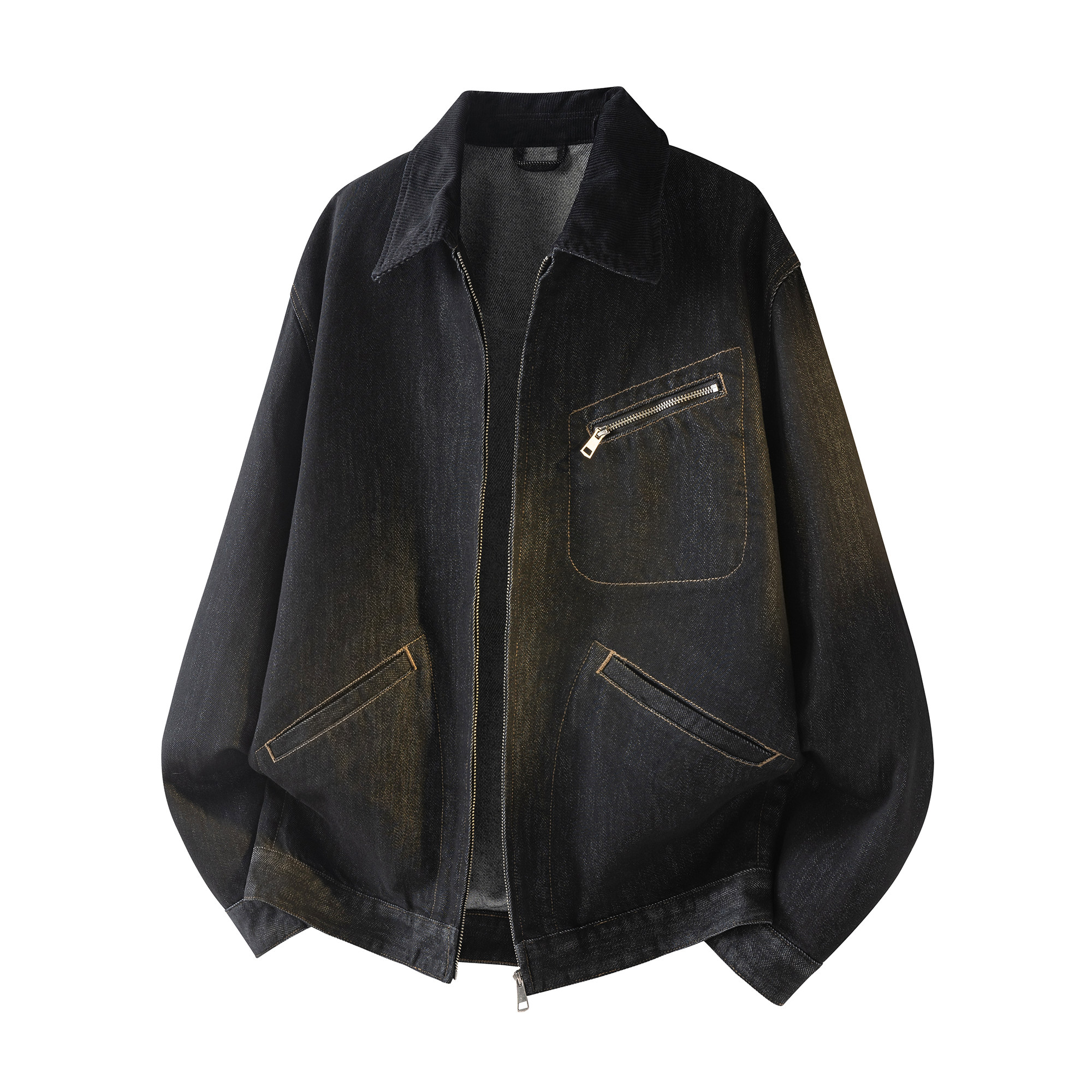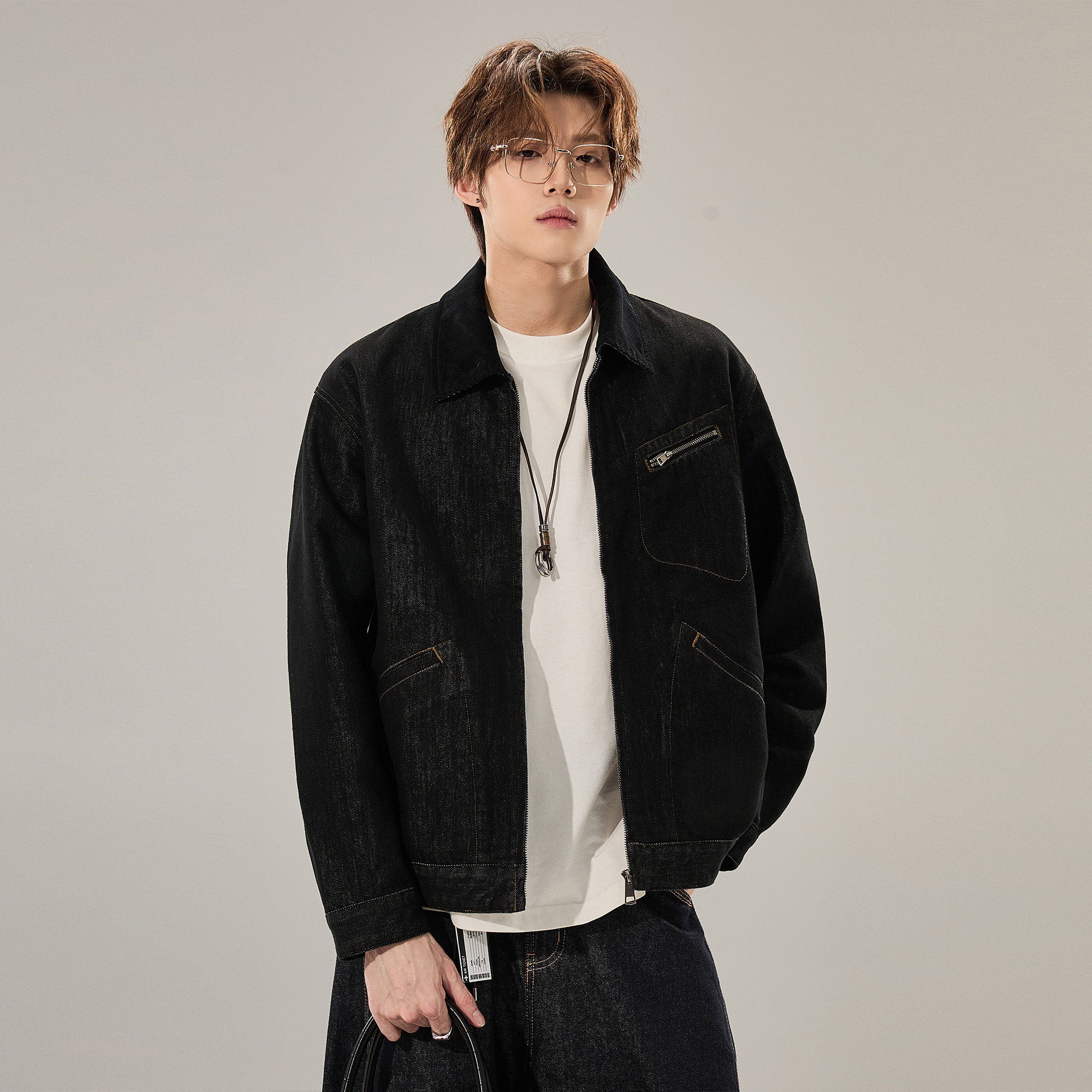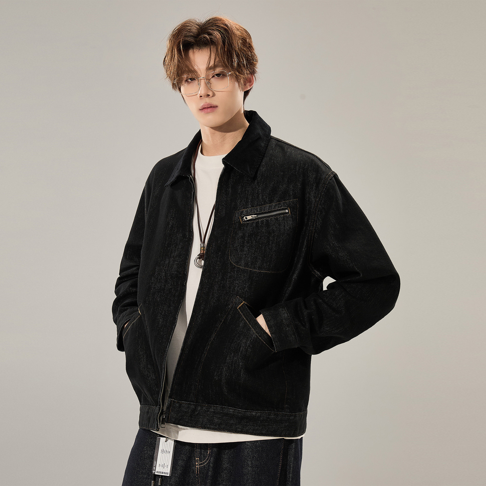 ALLIN 黑色水洗牛仔外套男春秋美式潮牌休闲宽松短款翻领情侣夹克