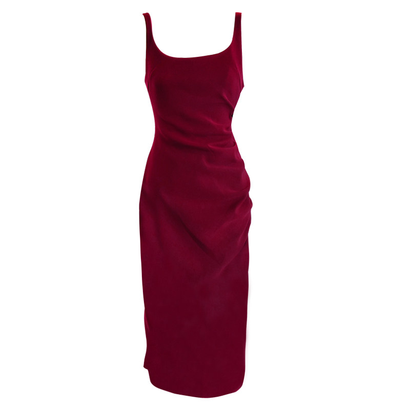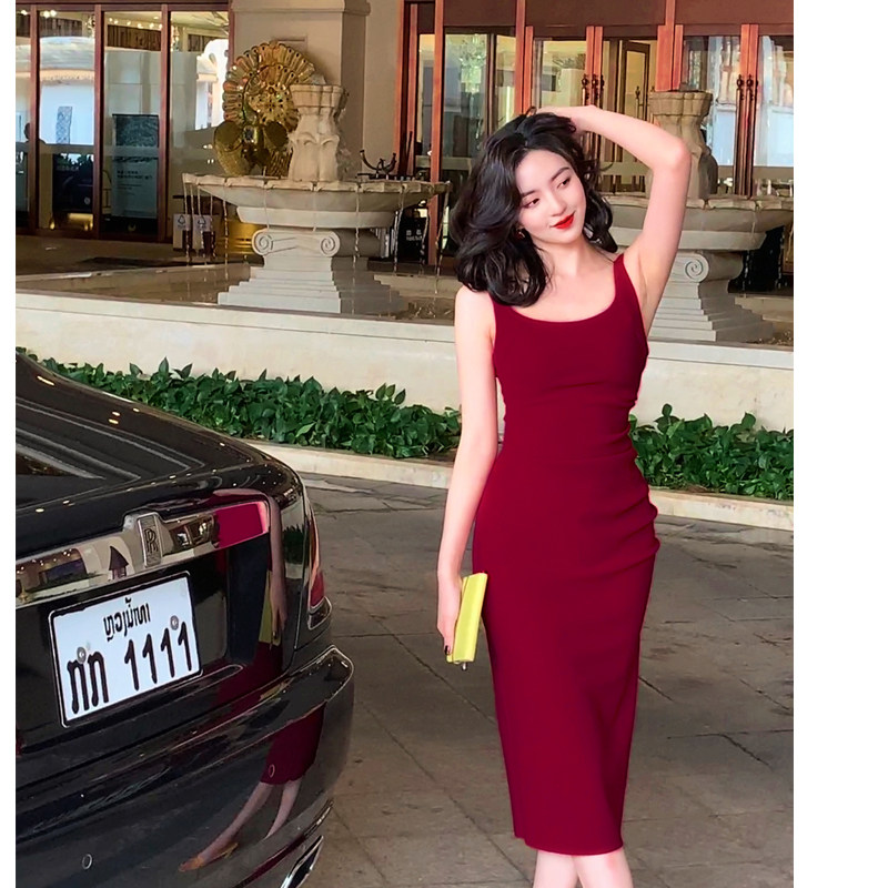 港风复古夏季连衣裙酒红色收腰显瘦吊带连衣裙弹力包臀中长款裙女