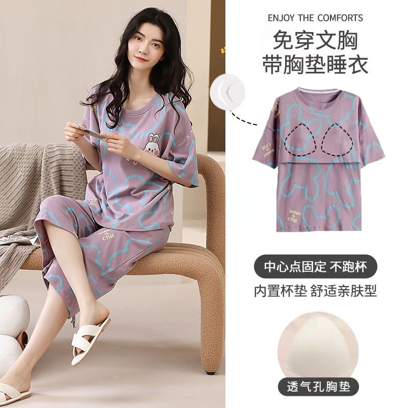 夏季大码自带胸垫夏季睡衣女短袖七分裤胖mm200斤卡通家居服套装