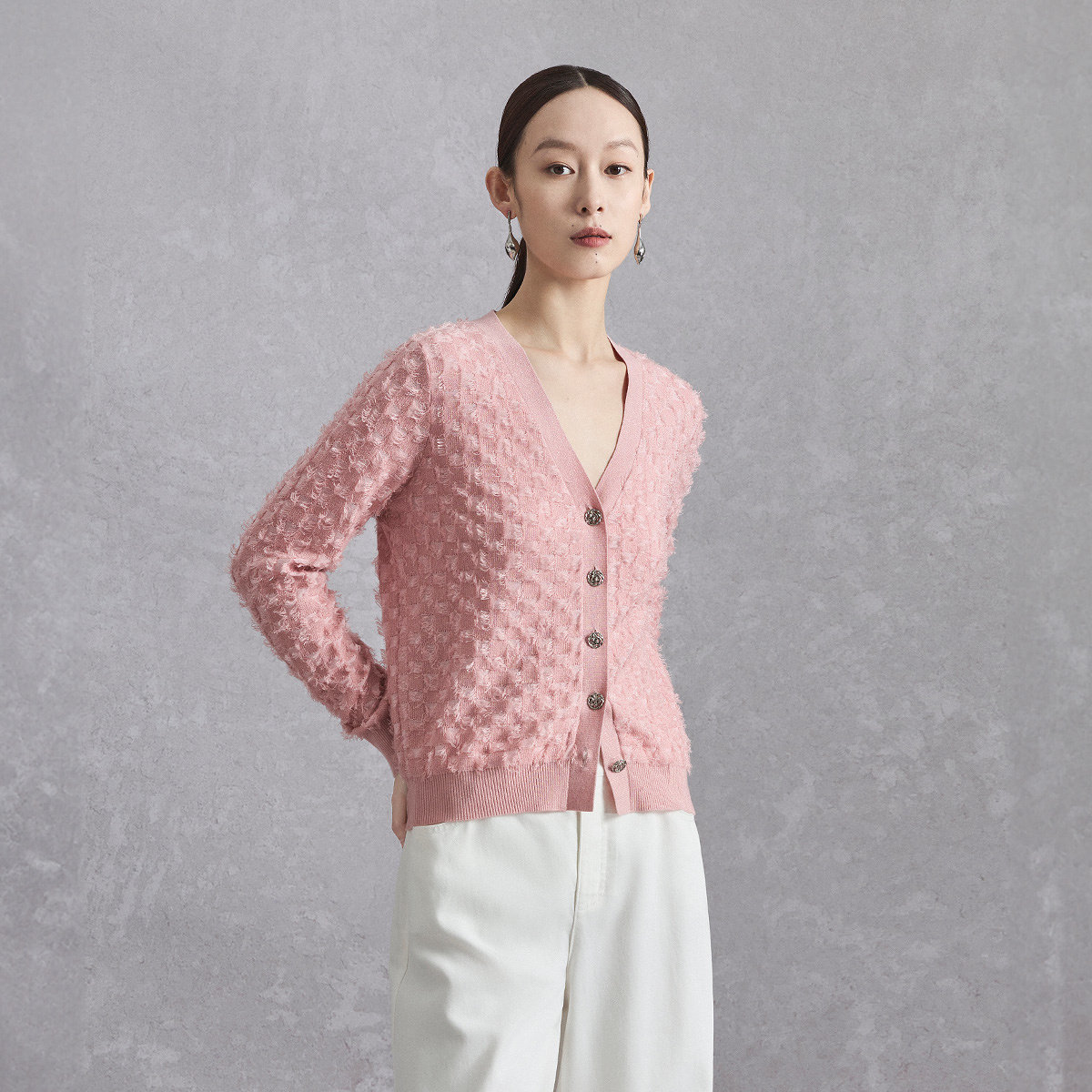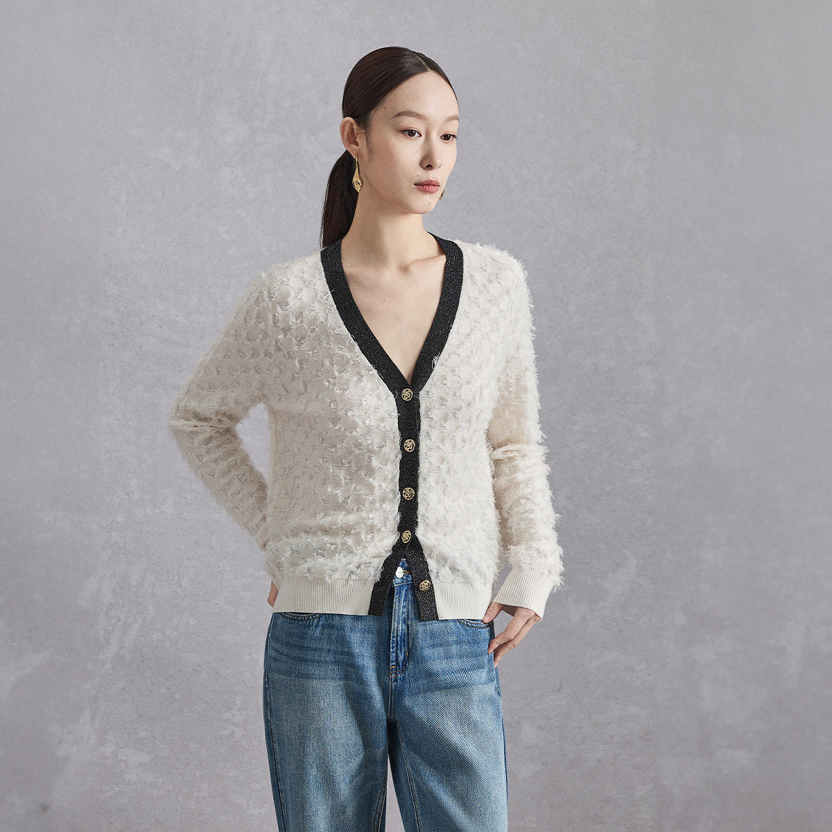 naivee纳薇秋款V领精致流苏棉羊毛针织开衫外套女氛围感气质