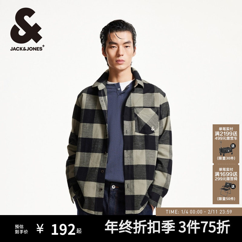 杰克琼斯男装潮流百搭时尚尖领刺绣贴袋口袋撞色格纹秋季磨毛衬衫