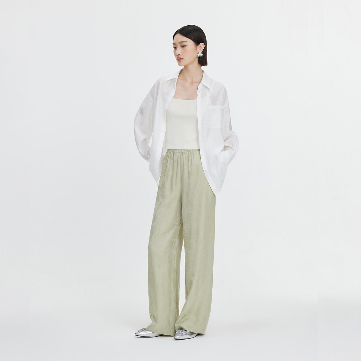 naivee纳薇秋新中式宽松休闲裤女醋酸高腰显瘦垂坠感薄阔腿裤