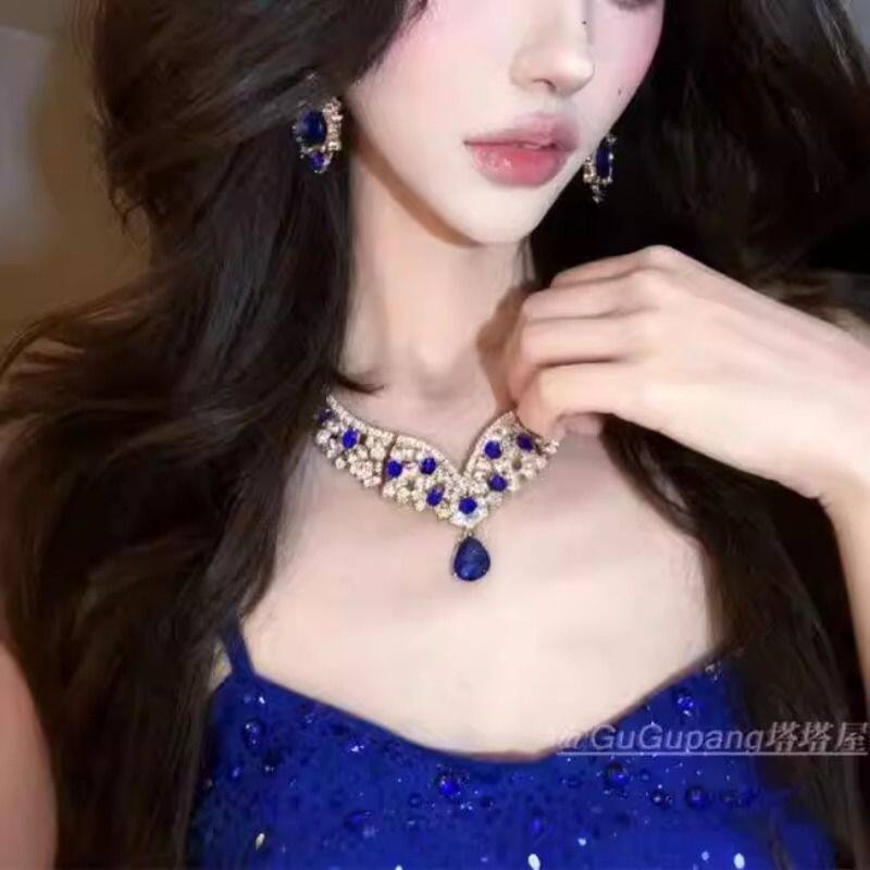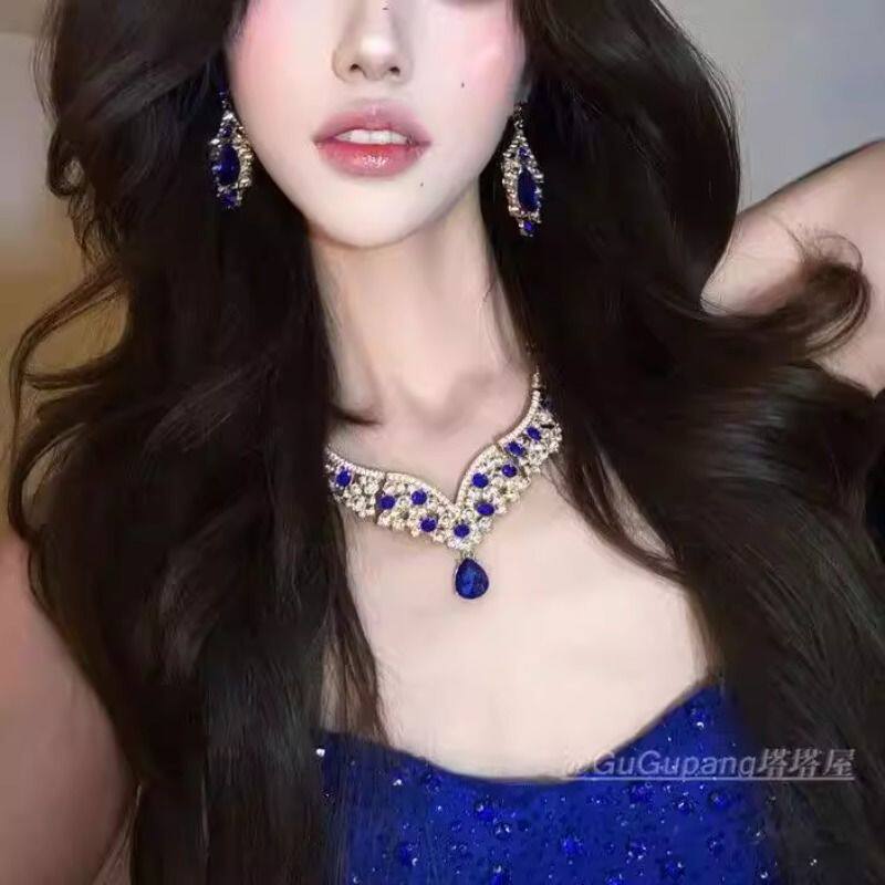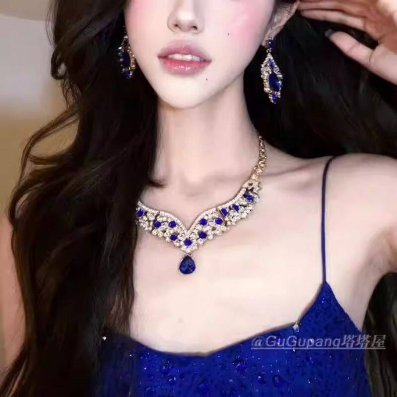 纯欲奢华蓝色满钻项链耳环套装贵气高级感颈链宴会新娘礼服锁骨链