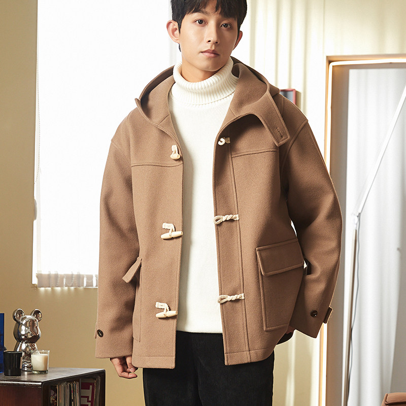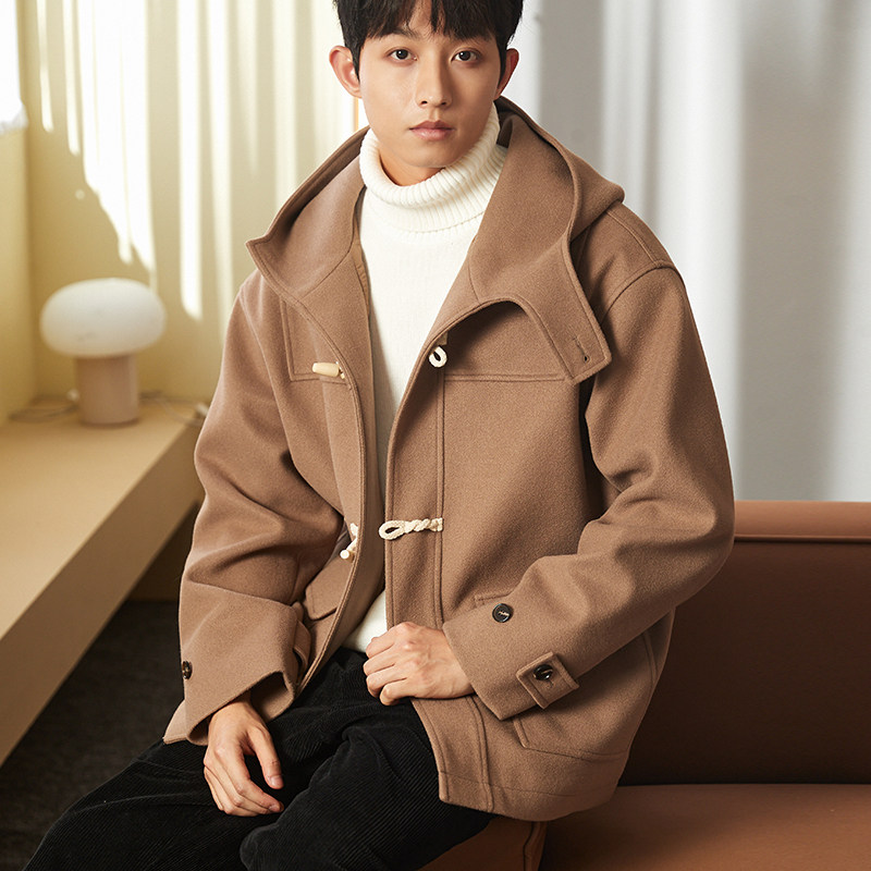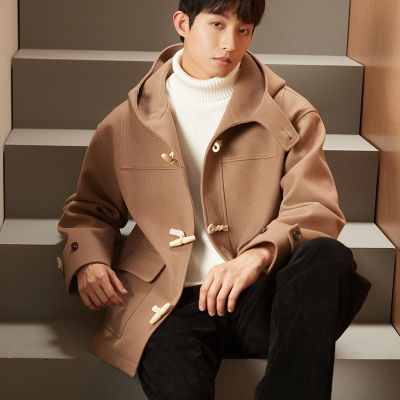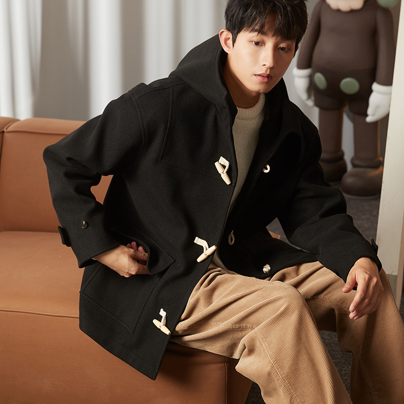 唐狮毛呢外套男装冬季新呢大衣连帽牛角扣美拉德外套保暖加绒