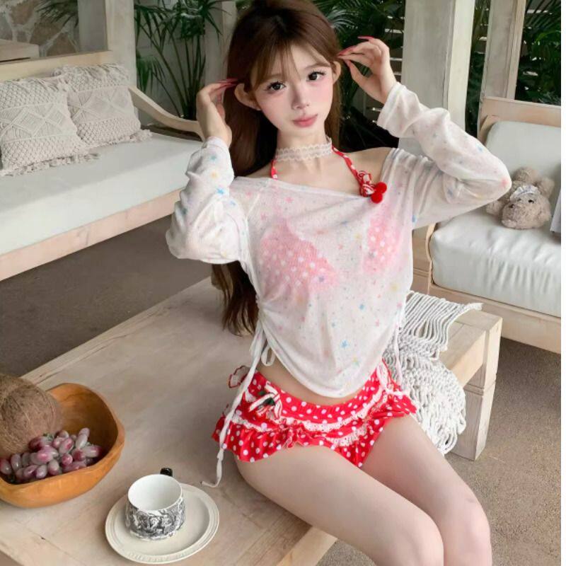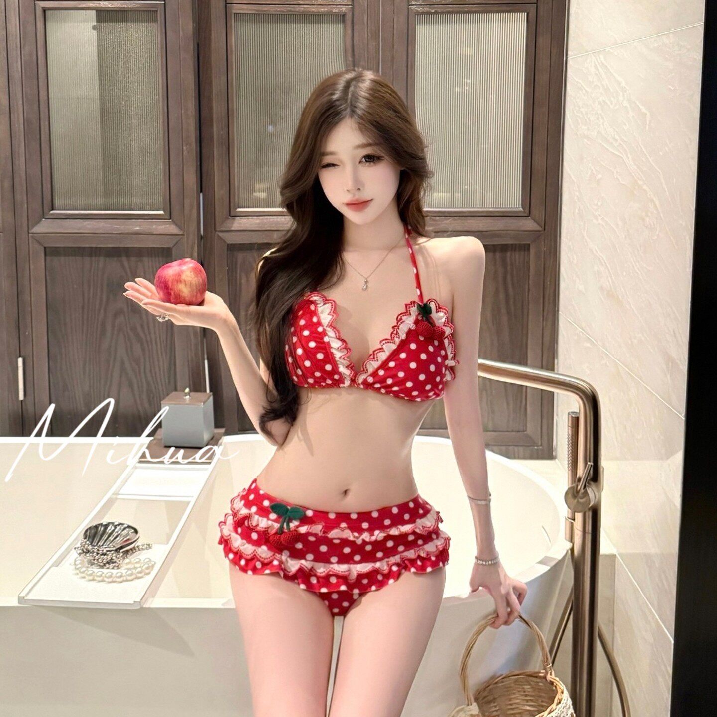 海边度假樱桃波点性感泳衣女纯欲风分体裙式少女感比基尼三件套