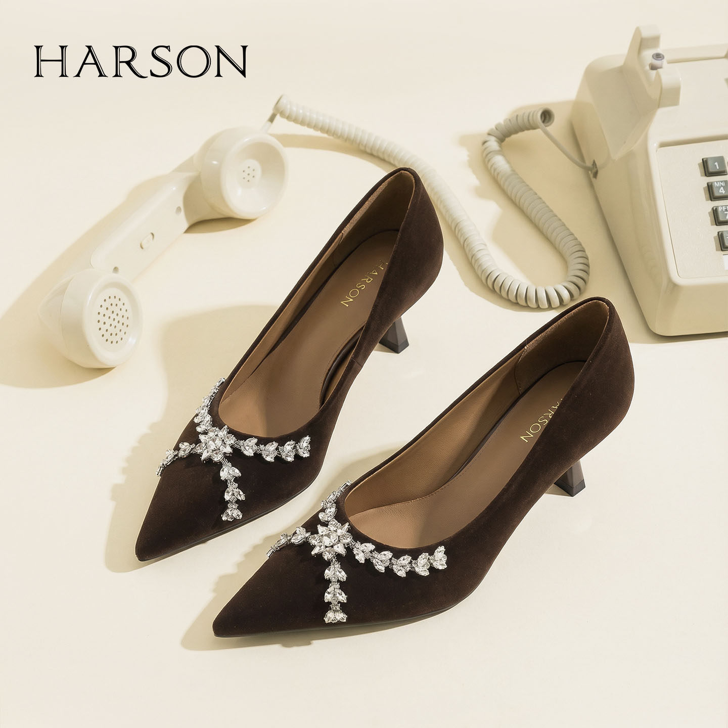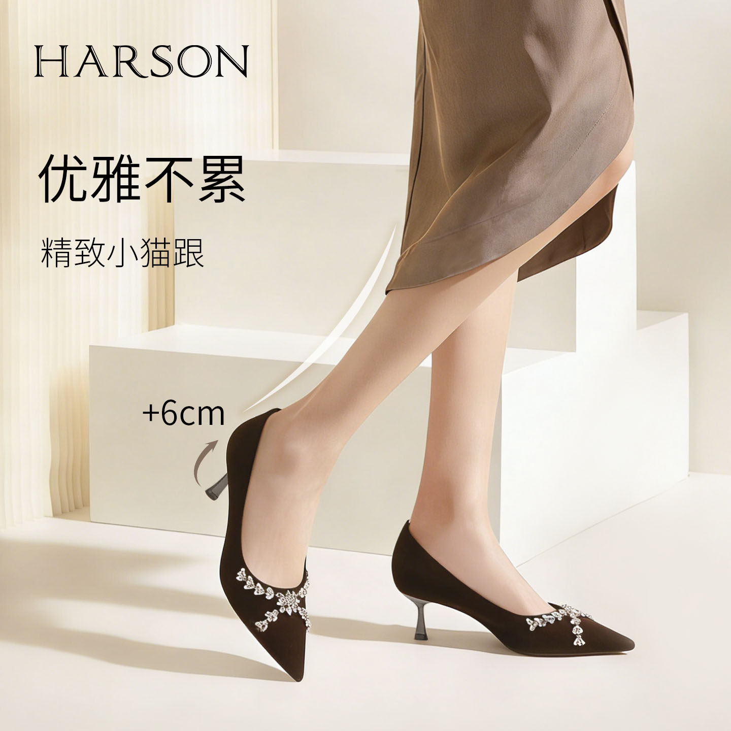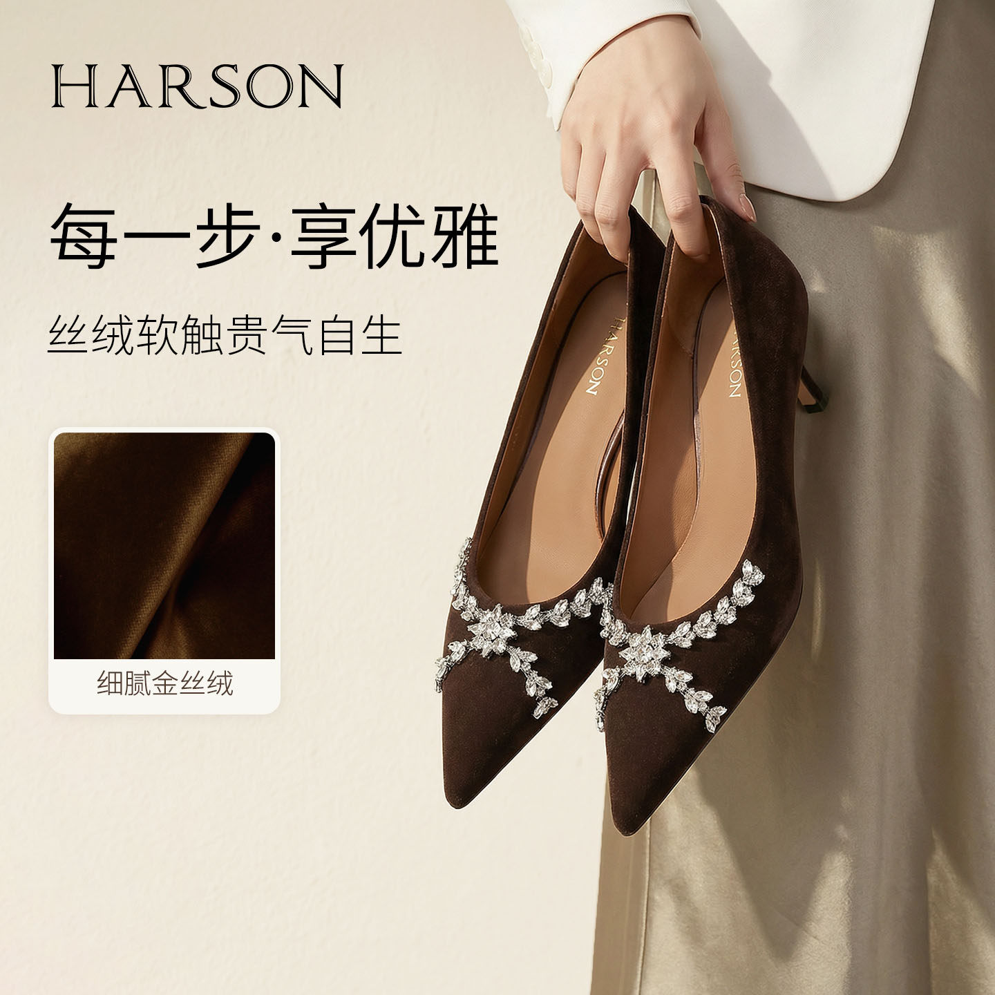 哈森气质尖头水钻绒面高跟鞋通勤上班女鞋2025秋季新款HWL250169