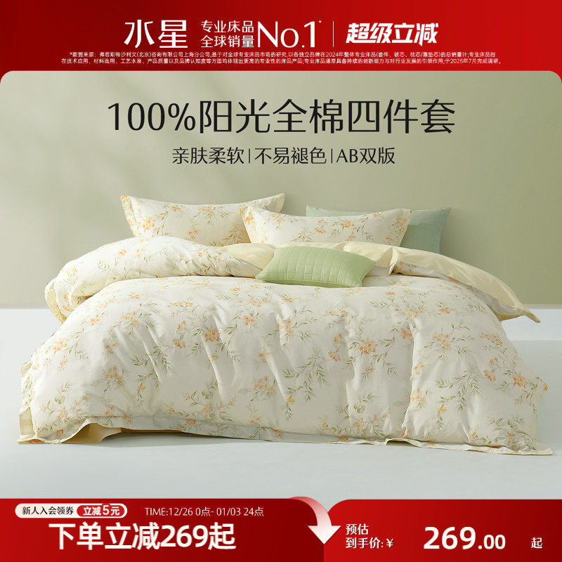 水星家纺纯棉全棉四件套家用套件纯棉100花卉印花被套床单床品